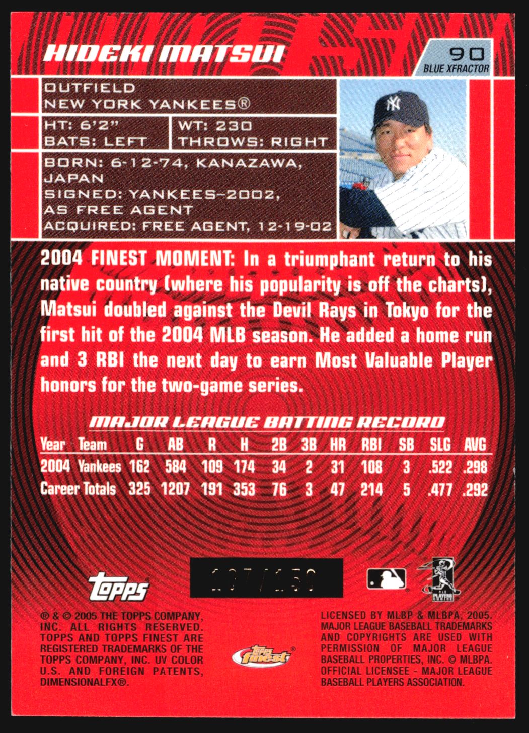 | 2005 Topps Finest HIDEKI MATSUI Blue XFractor Refractor /150 #90 | ||||||||||||||||||