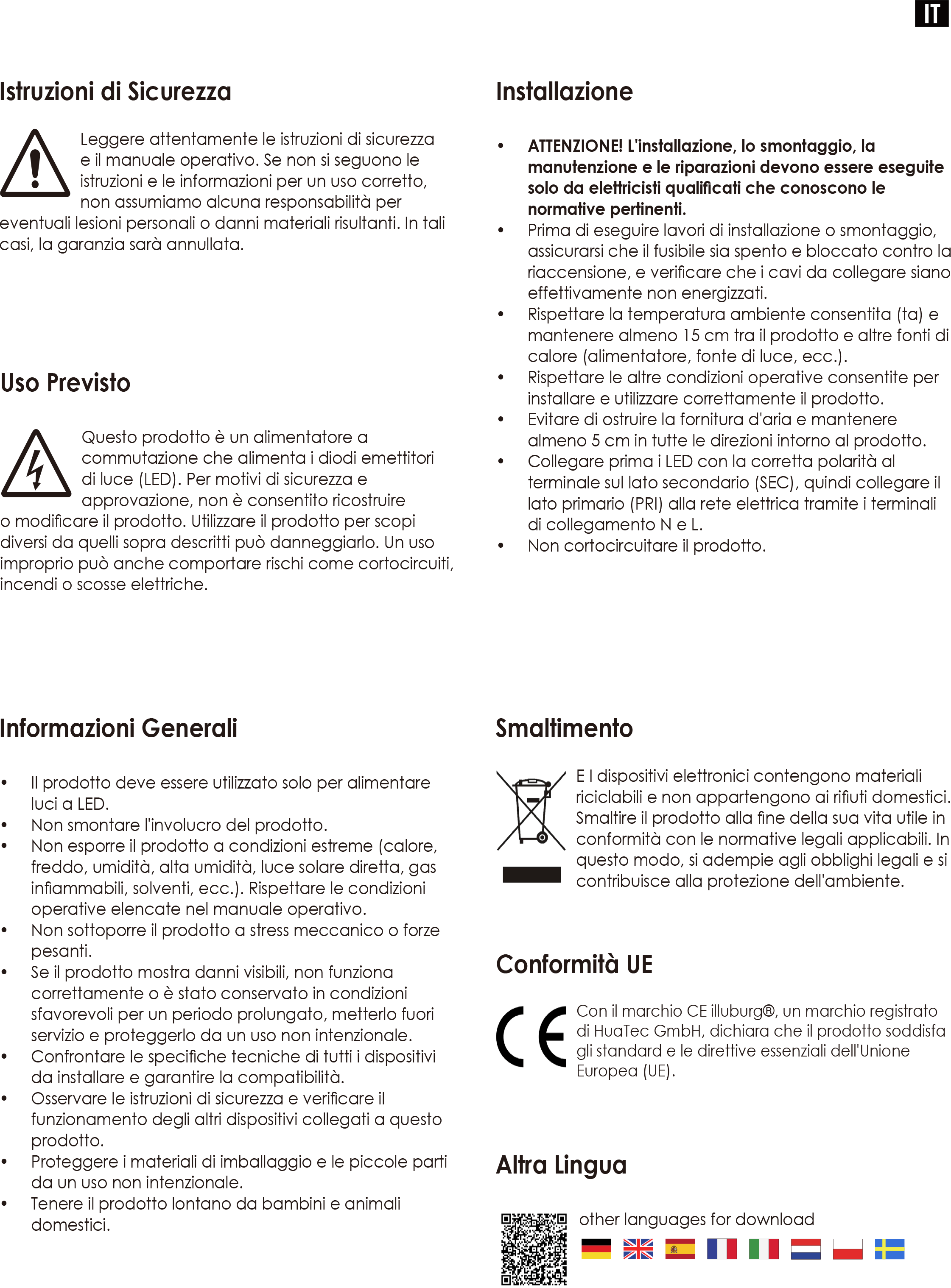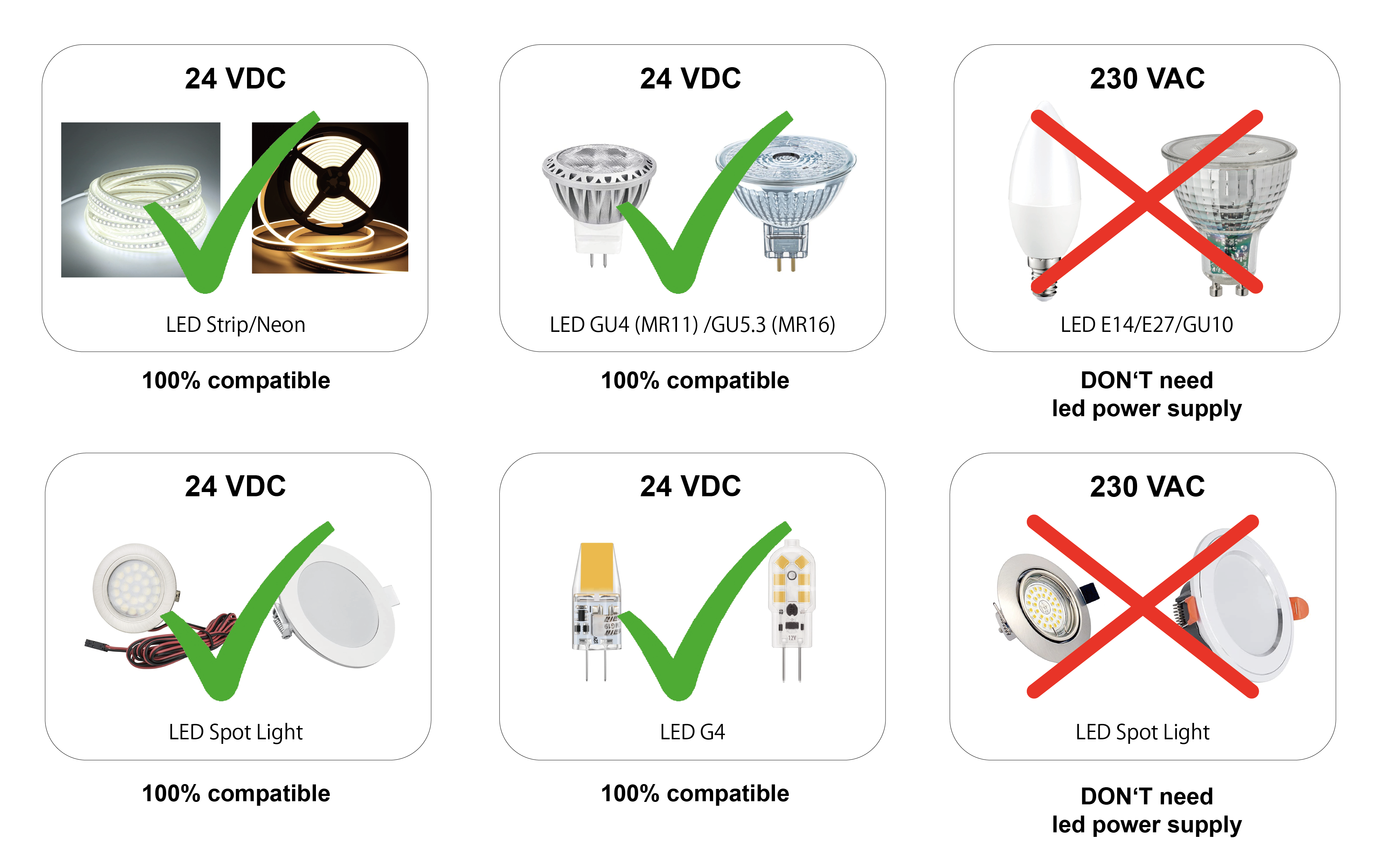 - Uscita: Tensione costante 24 V, non dimmerabile.