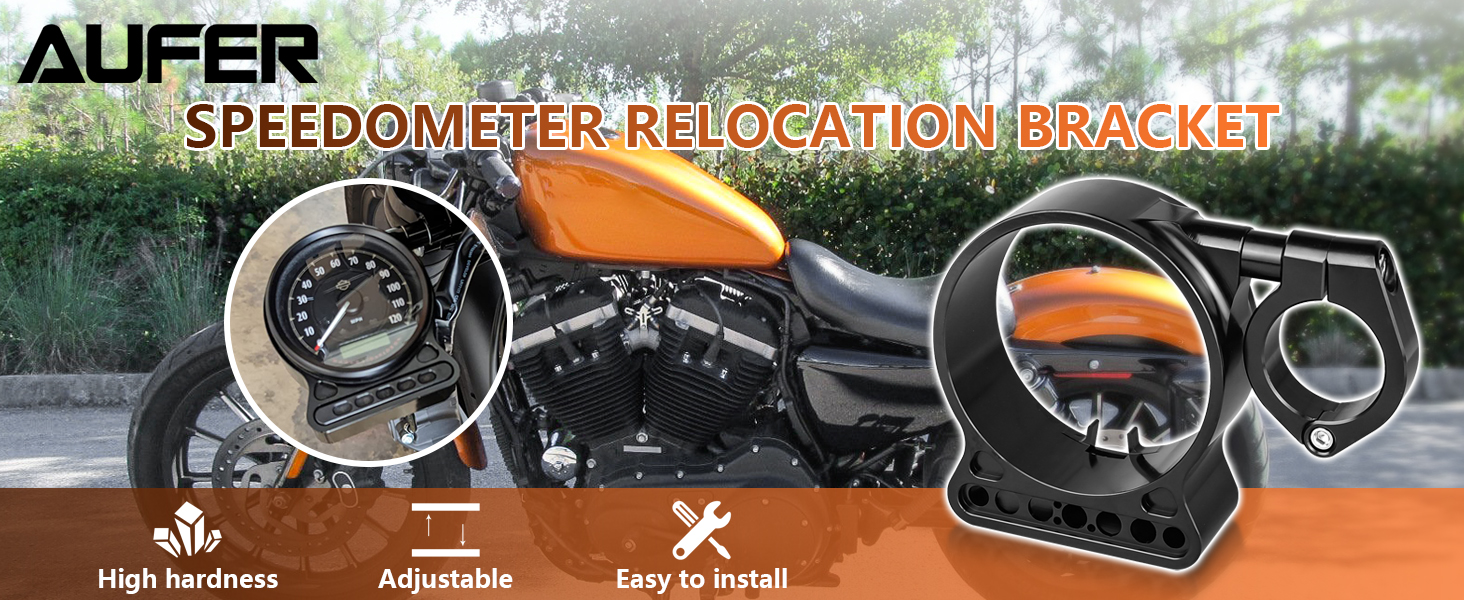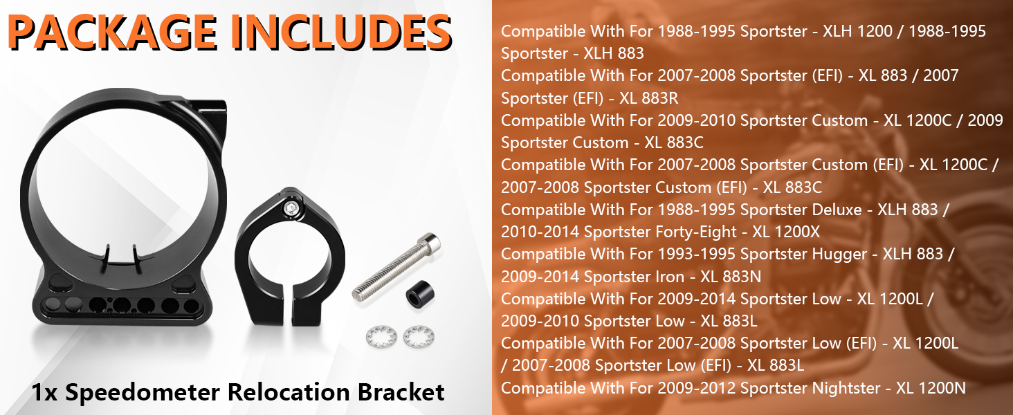 `Fitment: The speedometer relocation bracket Kit is compatible with for Sportster XL 883 1200 1995-2014 with 39MM Fork Tuber (Except 14 XL 48 model) XL 883C/1200C, XL 48 Models Require Speedo Backing Plate And Cushioning. `Material: The speedometer bracket is made of high-quality aluminum alloy and fully CNC machined.Exquisite production technology,beautiful appearance,sturdy and wear resistant,not easily rusted or deformed.Speedometer bracket diameter: 90.5mm/3.56 '',installation fork diameter: 39mm/1.54 ''. `Features: By disassembling your basic handlebar bracket,the visibility above the handlebars is greatly improved,and the visibility of the speedometer is also enhanced.The speedometer relocation bracket is placed on the left side of the fuel tank and below the handlebars,with adjustable functions that allow you to adjust the most suitable direction and angle according to your needs. `Function: The speedometer relocation mounting bracket kit is used to reposition your speedometer and indicator lights,and makes it easy to see the fuel tank and other driving data.The speedometer relocation bracket kit is directly installed onto the 39mm left fork tube without the need for disassembly or modification. `The products include 1 set side mount speedo odometer relocation bracket.Stylish and clean appearance,perfectly match the original motorcycle,effectively improving the appearance of the motorcycle and making it stand out from the crowd.