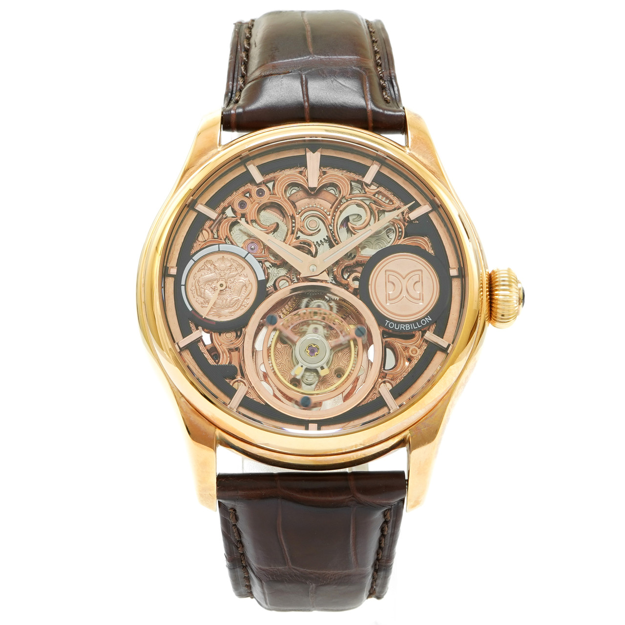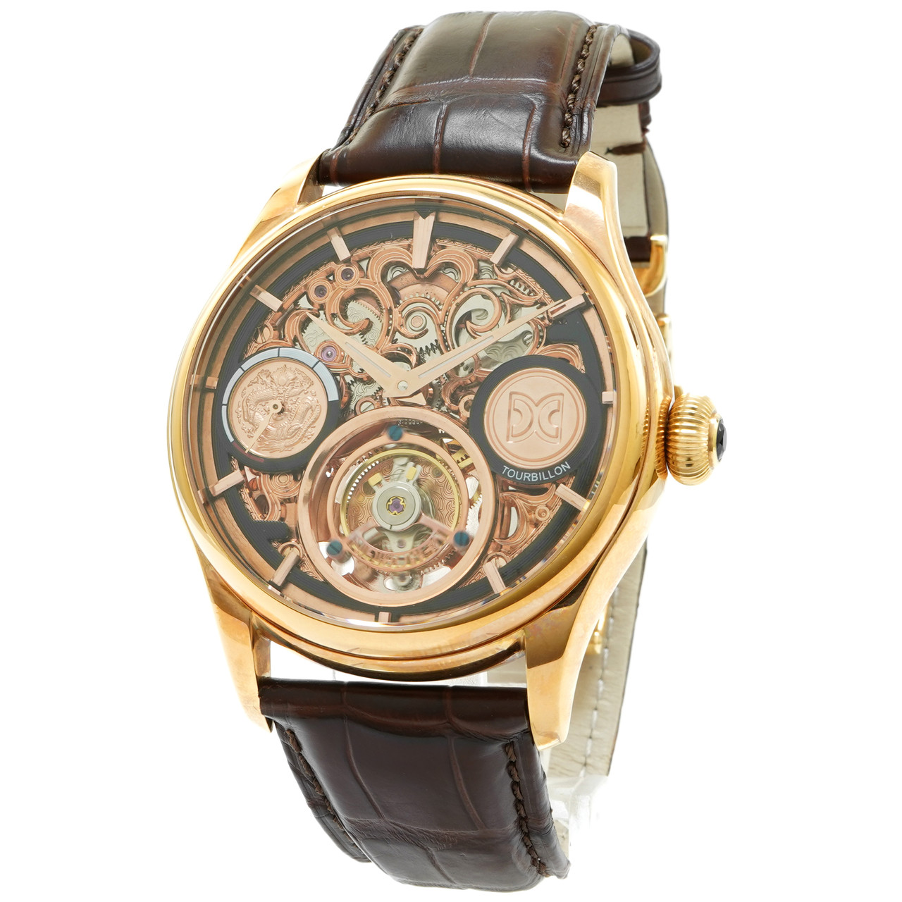 Brand: MemoriginModel Name: Memory Gin Tourbillon SkeletonReference: MO1001GCondition: Pre-Owned. Very Good Condition. Shows almost no signs of wear.Strap: Alligator - UsedCase Size: 44mmCase Metal: Gold PlatedMovement: Manual WindFunctions: Time, TourbillonBox and Papers: No.*CERTIFIED 100% AUTHENTIC - ALL WATCHES ARE GUARANTEED TO BE 100% AUTHENTIC.Inventory Number: 7694