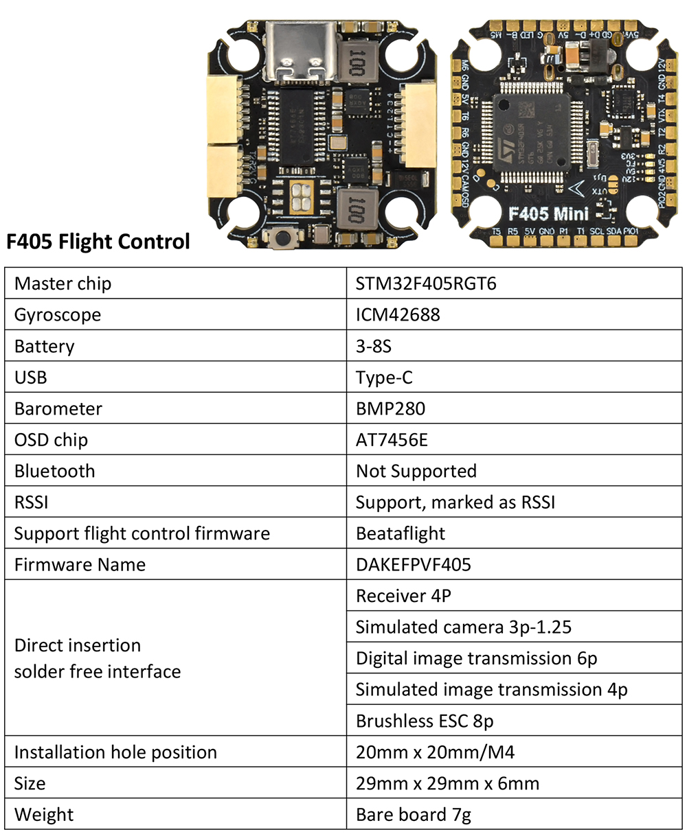 F405 Flight Control Specifications: Master chip: STM32F405RGT6 Gyroscope: ICM42688 Battery: 3-8S USB: Type-C Barometer: BMP280 OSD chip: AT7456E Bluetooth: Not Supported RSSI: Support,marked as RSSI Support flight control firmware: Beataflight Firmware Name: DAKEFPVF405 Installation hole position: 20X20mm/M4 Size: 36mm x36mx8m Weight: Bare board 8g