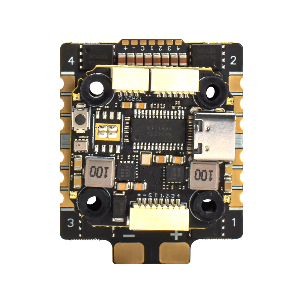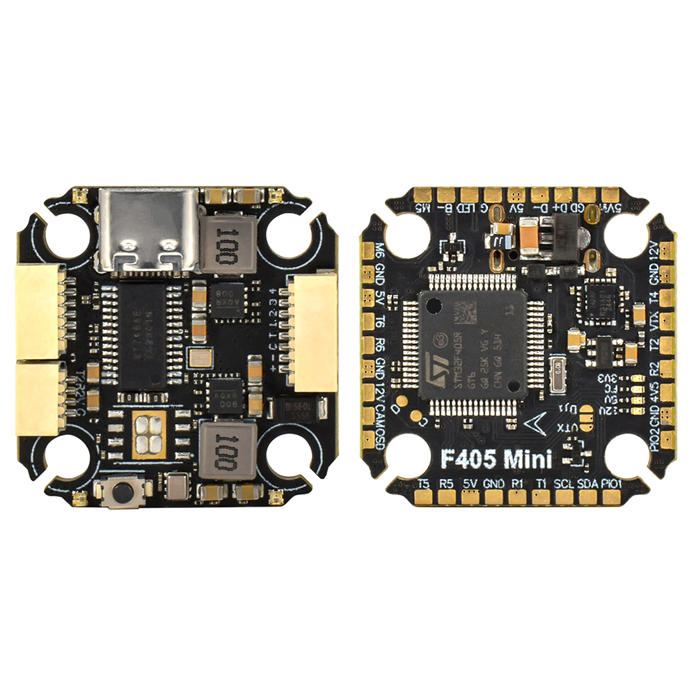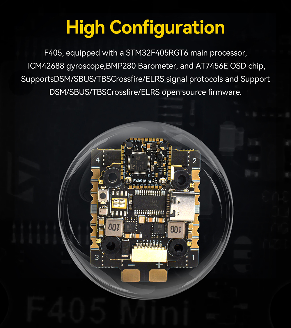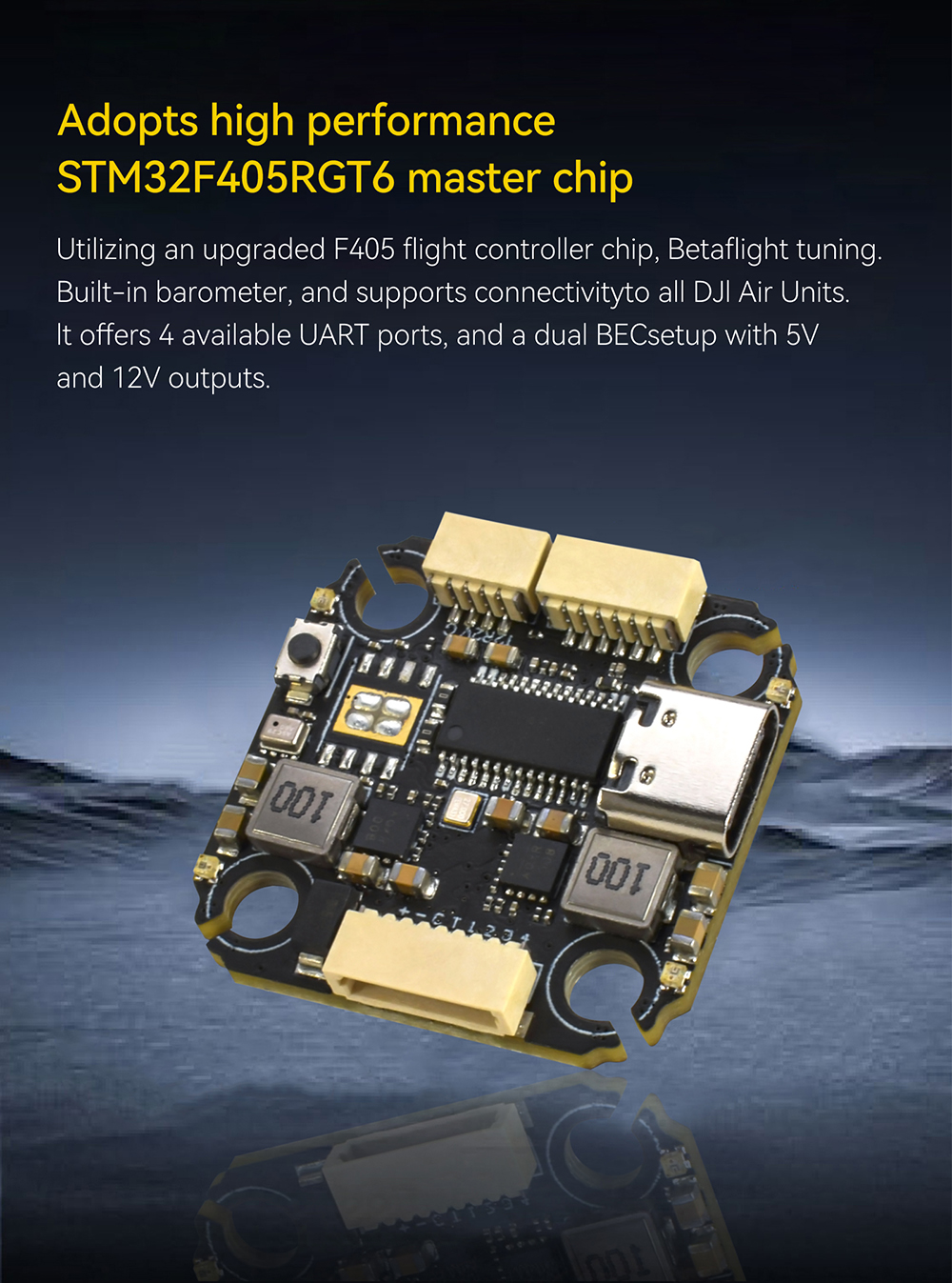 Description: F405 Flight Stack Support Bluejay firmware, bidirectional DSHOT,,Using large solder pads, the pads are kept away from the components to ensure perfect soldering for beginners.Supports connectivity to all DJl Air Units,offers 4 available UART ports.F405 main control chip, onboard OSD chip, barometer are also available even in complex flight environments.