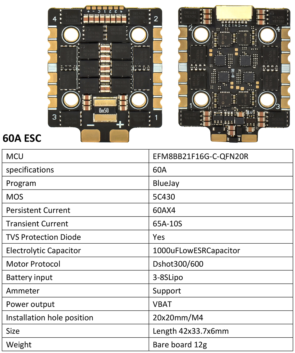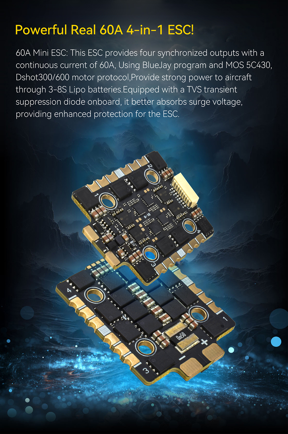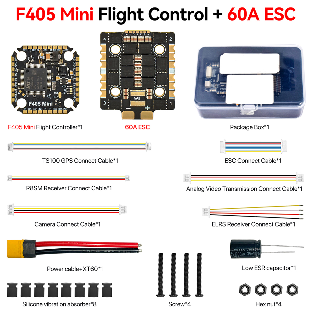 Description: F405 Flight Stack Support Bluejay firmware, bidirectional DSHOT,,Using large solder pads, the pads are kept away from the components to ensure perfect soldering for beginners.Supports connectivity to all DJl Air Units,offers 4 available UART ports.F405 main control chip, onboard OSD chip, barometer are also available even in complex flight environments.