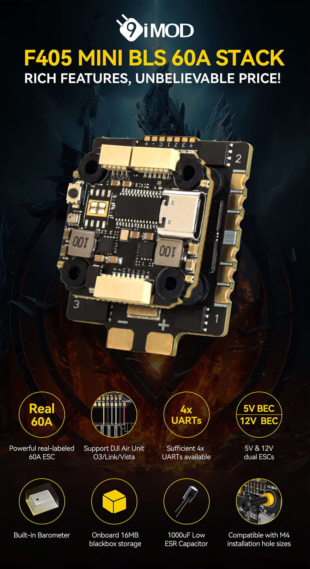 9IMOD MINI F405 Flight Stack F405 Flight Control 60A ESC 3-8S Lipo 20x20mm ICM42688 Gyro For Remote Control 7-10inch FPV Racing Drone