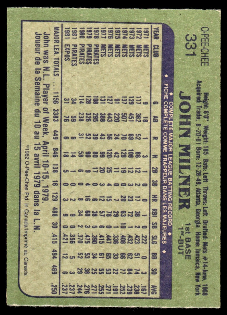 | 1982 O-Pee-Chee John Milner Montreal Expos #331 | ||||||||||||||||
