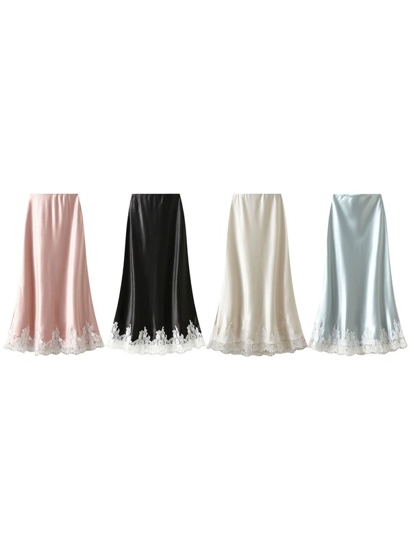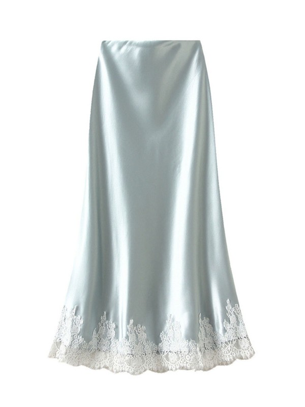 The lustrous lace patchwork on the silk-satin fabric adds a touch of luxury and sophistication, aligning with the current fashion trend of combining textures.