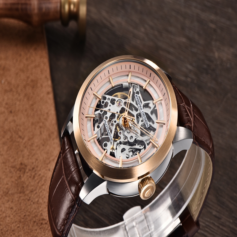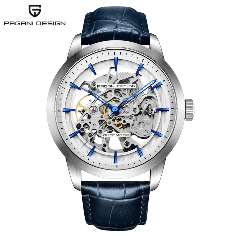 PAGANI DESIGN Men's Automatic Watch Leather Strap Skeleton Dial 43mm Wristwatch