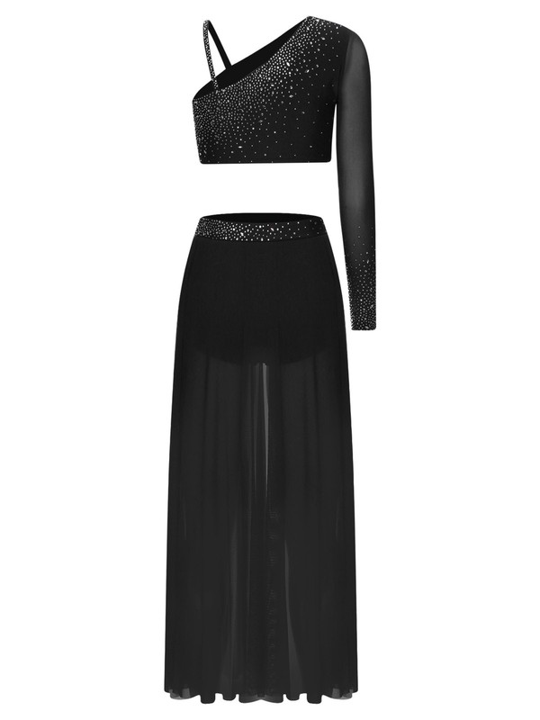 Made from a blend of polyester, spandex and rhinestones, the outfit is stretchy, shiny and comfortable, ensuring ease of movement during dance.