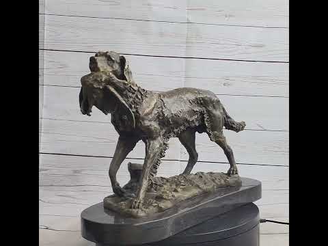 In this captivating bronze sculpture, the artist skillfully captures a moment of triumph as a shaggy dog proudly parades with a bird clutched firmly in its mouth, a testament to its successful hunt. The dog's wild and frayed fur adds to its rugged charm, indicating its comfort and affinity with the natural world. With each strand of fur depicted in intricate detail, the sculpture exudes a lifelike quality that is sure to resonate with lovers of dogs and the great outdoors alike.