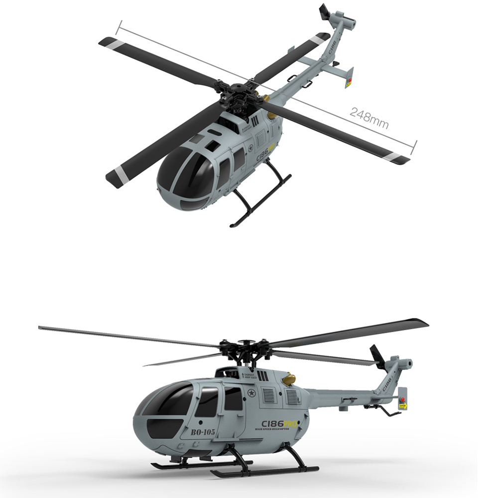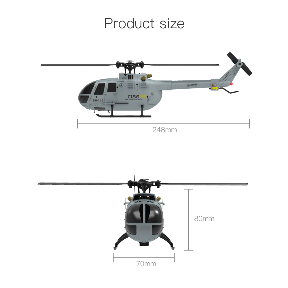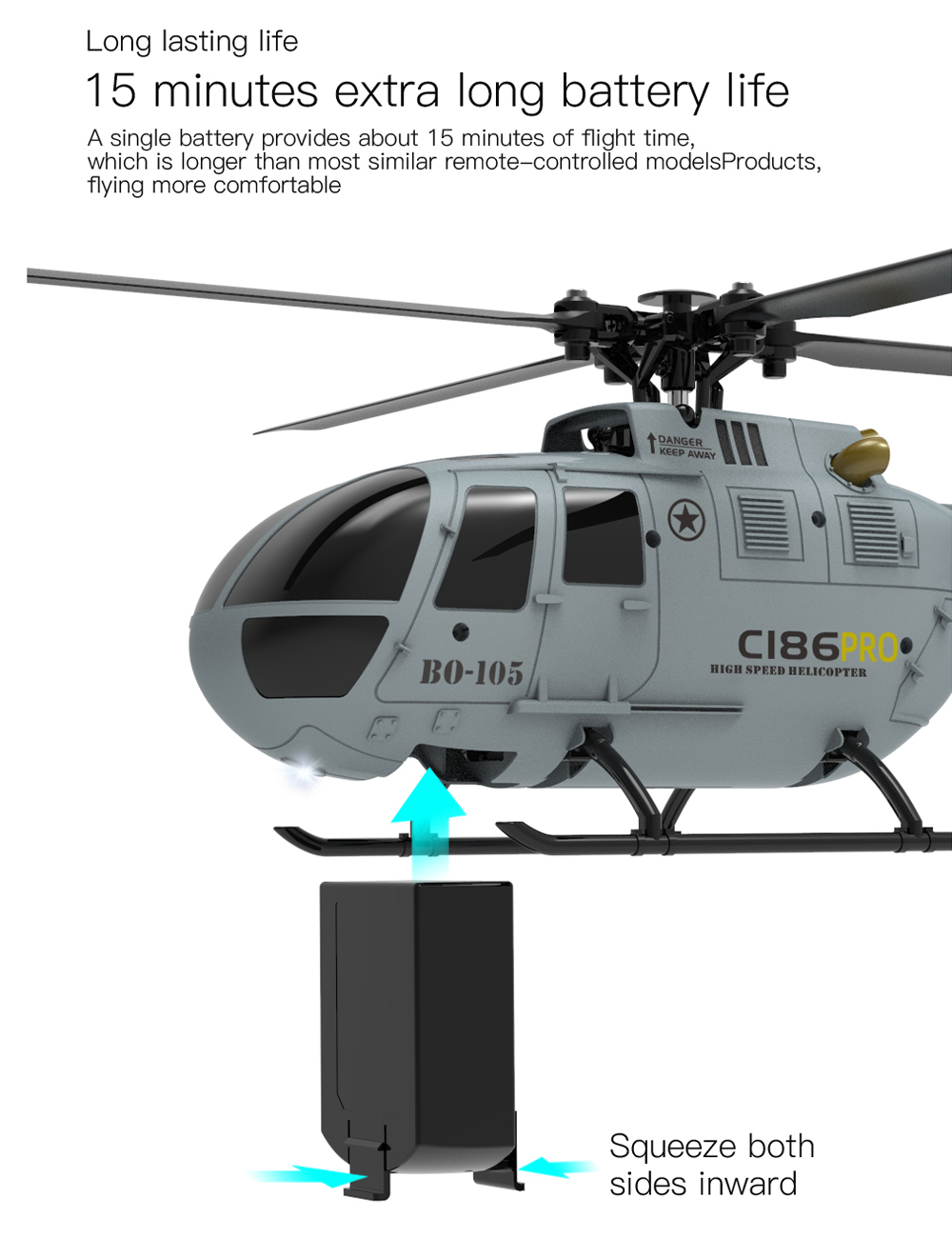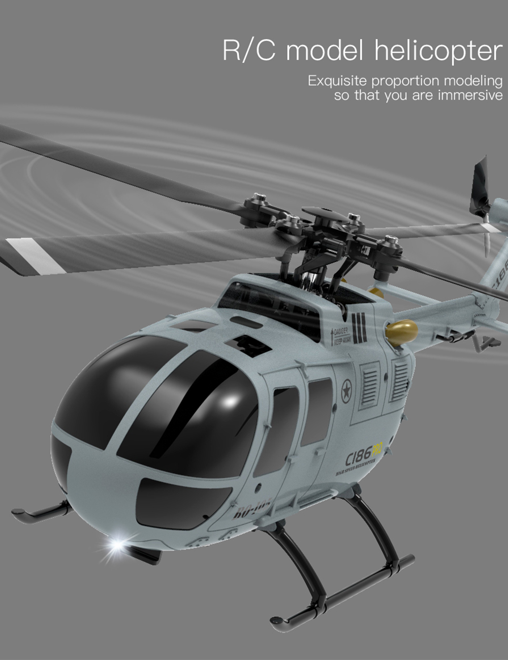 RC ERA BO-105 Helicopter 1/48 Scale 4 Channels 15min flight time 6-axis Gyro C186 Aircraft Optical flow positioning Remote Control Aircraft Features: 1. Equal scale reduction: 1:34 scale reduction , with high simulation appearance details and cool lighting. 2. lithium polymer battery, large capacity,Light weight,small size, safe performance, 3. Using a 6-axis gyroscope for ultra stable flight; 4. high rate battery: lithium polymer 7.4V(350mAh) battery, high discharge rate, long life flight time of about 15 minutes. 5.Powerful power: adopting no aileron design and dual-axis co-drive motors, more stable flight and reduce the chance of damage. 6.Optical flow positioning: Barometer height setting, optical flow positioning, more stable and accurate height. 7. 4 channel high-precision remote control, 2.4GHZ two-way communication protocol,Effectively enhance the user's precise control of the aircraft.