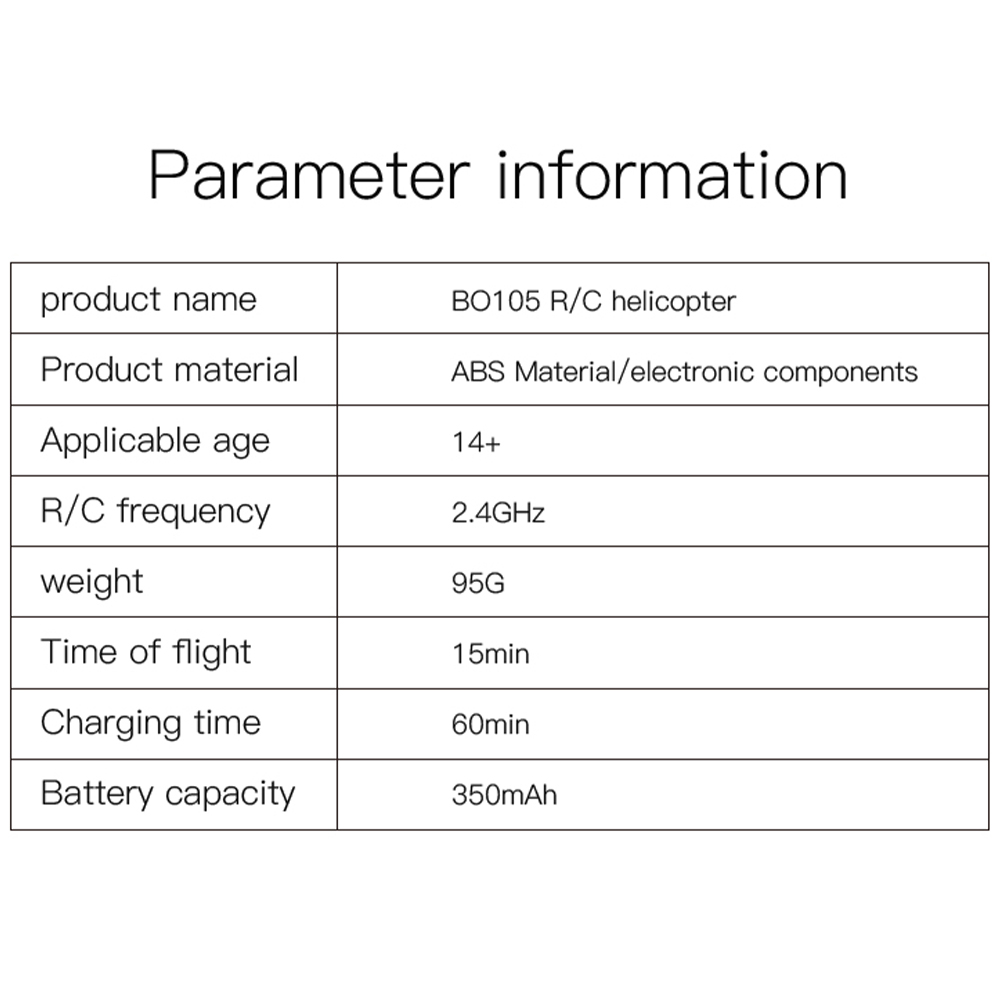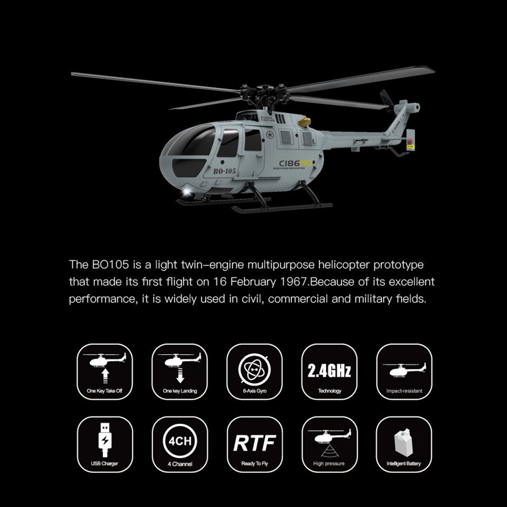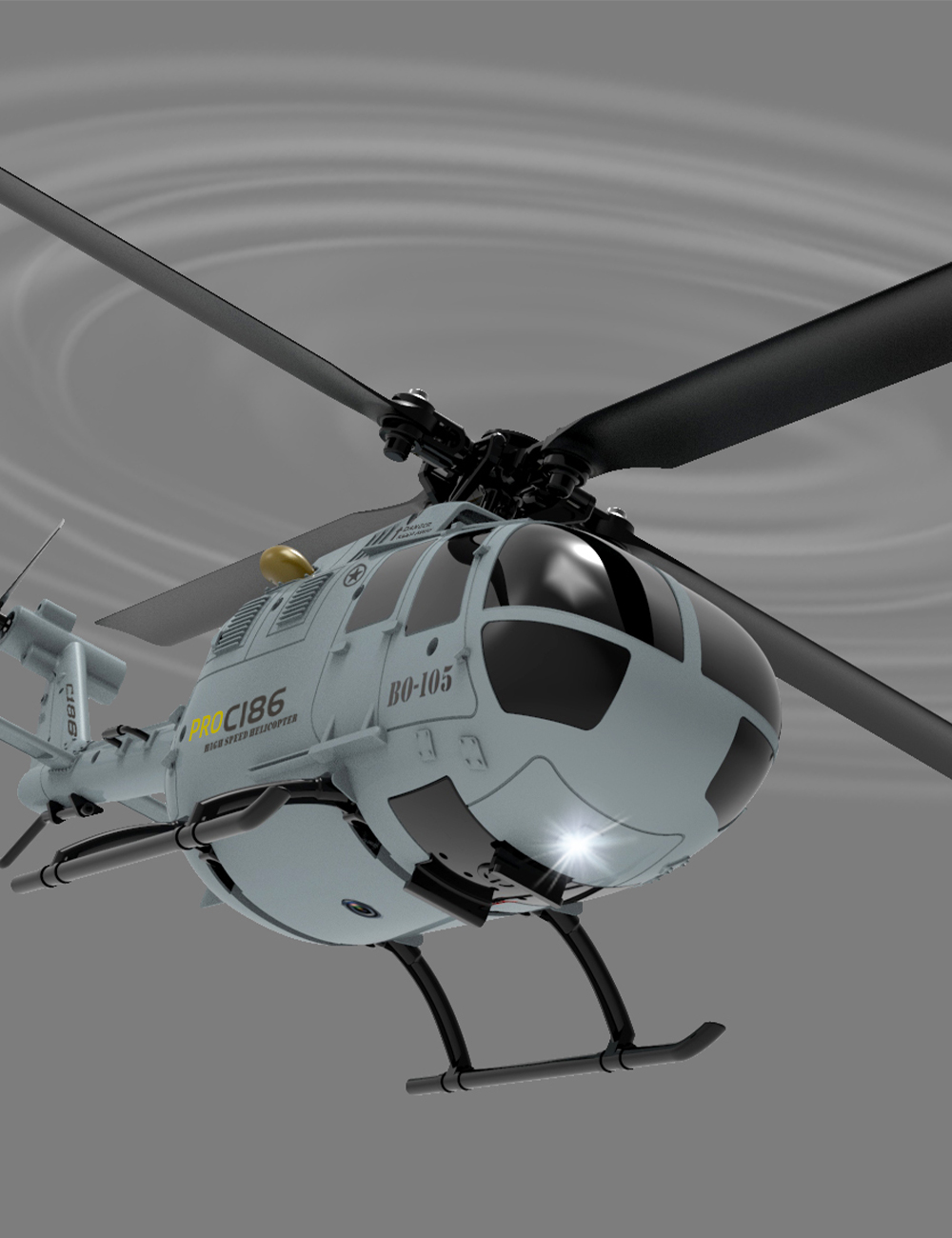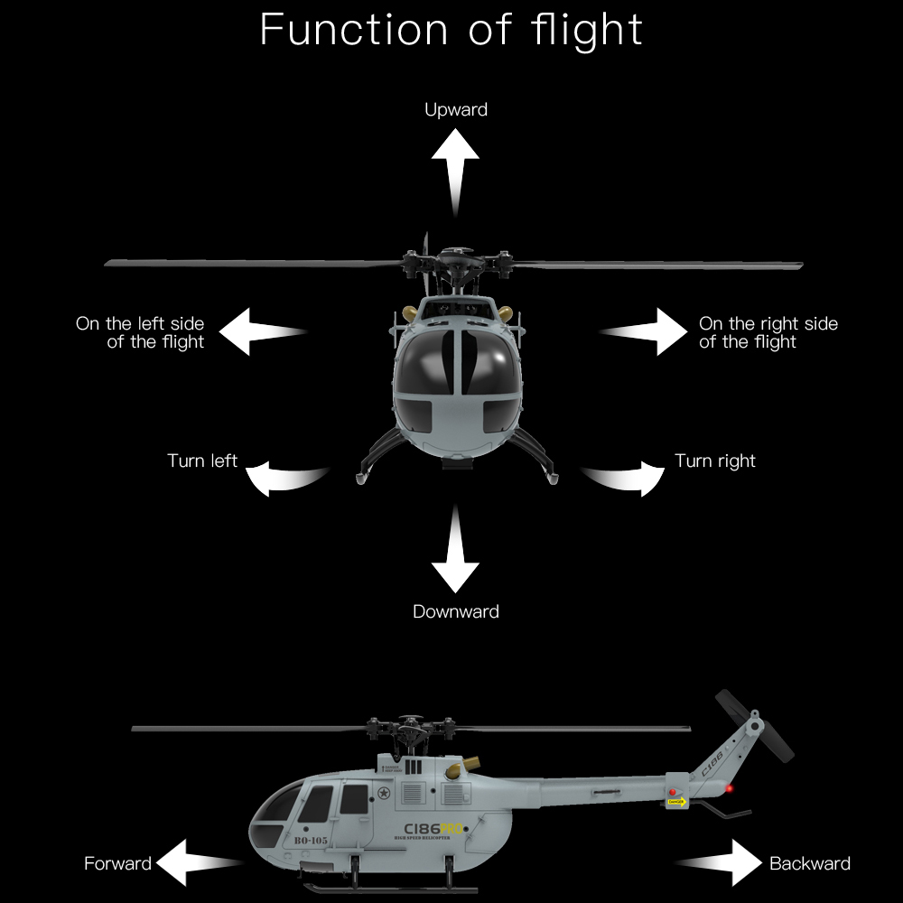 RC ERA BO-105 Helicopter 1/48 Scale 4 Channels 15min flight time 6-axis Gyro C186 Aircraft Optical flow positioning Remote Control Aircraft Features: 1. Equal scale reduction: 1:34 scale reduction , with high simulation appearance details and cool lighting. 2. lithium polymer battery, large capacity,Light weight,small size, safe performance, 3. Using a 6-axis gyroscope for ultra stable flight; 4. high rate battery: lithium polymer 7.4V(350mAh) battery, high discharge rate, long life flight time of about 15 minutes. 5.Powerful power: adopting no aileron design and dual-axis co-drive motors, more stable flight and reduce the chance of damage. 6.Optical flow positioning: Barometer height setting, optical flow positioning, more stable and accurate height. 7. 4 channel high-precision remote control, 2.4GHZ two-way communication protocol,Effectively enhance the user's precise control of the aircraft.
