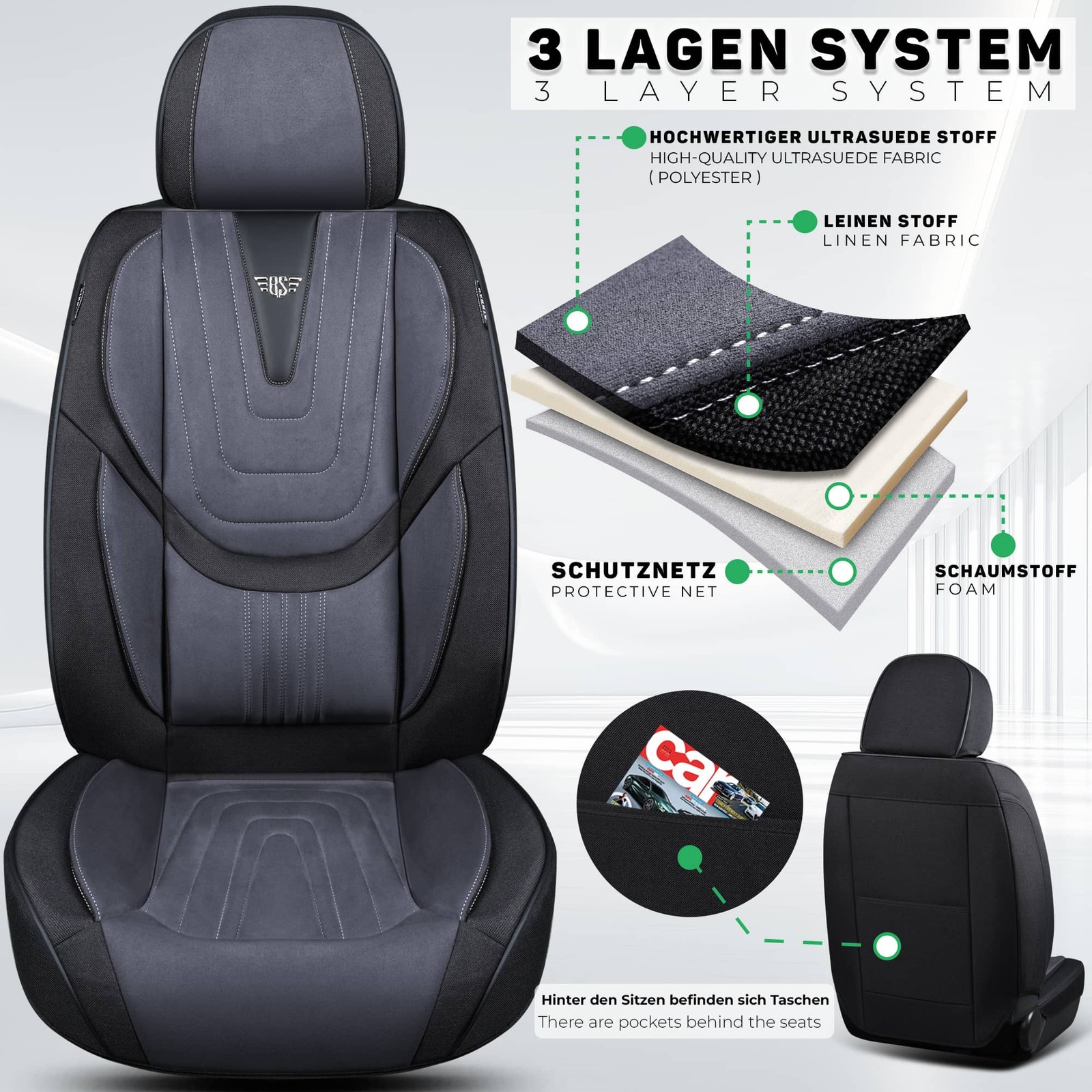 Machen Sie Ihr Fahrzeug komfortabler und langlebiger mit diesen praktischen und eleganten Schonbezügen! Schützen Sie Ihre Sitze und verleihen Sie Ihrem Auto gleichzeitig ein neues, hochwertiges Aussehen.
