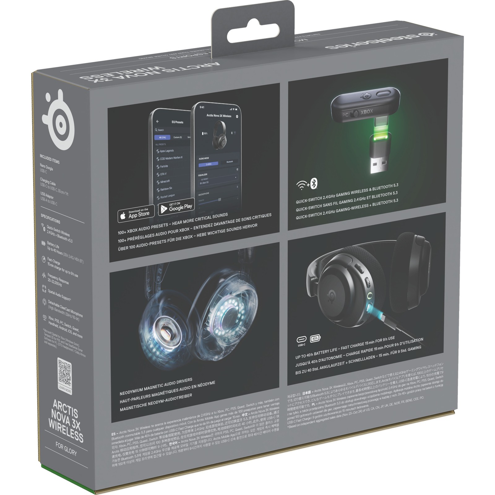 Plattformübergreifende Kompatibilität, Audio-Voreinstellungen für Call of Duty, Fortnite und mehr, Optimiertes Schnellladen, Dual-Gelenk-Design, Neodym-Magnettreiber, Quick-Switch Bluetooth, USB-C Plug & Play, 360° Raumklang, Arctis Companion Mobile App |