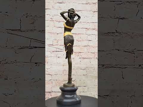 The sculpture stands on a round black marble base, adding to its visual impact and complementing the overall Art Deco design. The use of a brown and gold patina finish enhances the piece with a rich and elegant color scheme, reflecting the luxurious and glamorous elements often associated with Art Deco art. The choice of a round base adds a sense of balance and completeness to the composition.