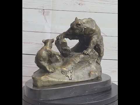 Immerse yourself in the wonders of nature with the captivating bronze sculpture titled ""Mother Bear and Cub."" This exquisite artwork portrays a tender and educational moment between a mother bear and her young cub in the rugged terrain of a mountainside. With her immense strength, the mother bear skillfully pries back a heavy stone, revealing a treasure trove of moths and grubs for her curious offspring. The young cub attentively watches, absorbing the valuable lesson on foraging while safely clinging to a sturdy rock.Crafted with meticulous attention to detail, this bronze sculpture is a testament to the ancient technique of lost-wax casting, a method that ensures the faithful reproduction of intricate textures and lifelike forms. The sculpture bears a rich brown patina finish, adding depth and warmth to the artwork, while also serving as a protective layer for long-lasting preservation. Resting upon a sleek black marble base, the sculpture stands as a testament to the artist's skill and creativity. It proudly bears the signature of the esteemed artist, Russelle, further affirming its quality and artistic value.Invite the captivating beauty of the natural world into your space with ""Mother Bear and Cub."" This remarkable bronze sculpture captures the essence of maternal love, resilience, and the teachings of the wild. Whether displayed as a centerpiece in a nature-inspired collection or as an accent piece in a rustic-themed decor, this artwork is a timeless celebration of the bond between mother and child, reminding us of the profound lessons that nature imparts.