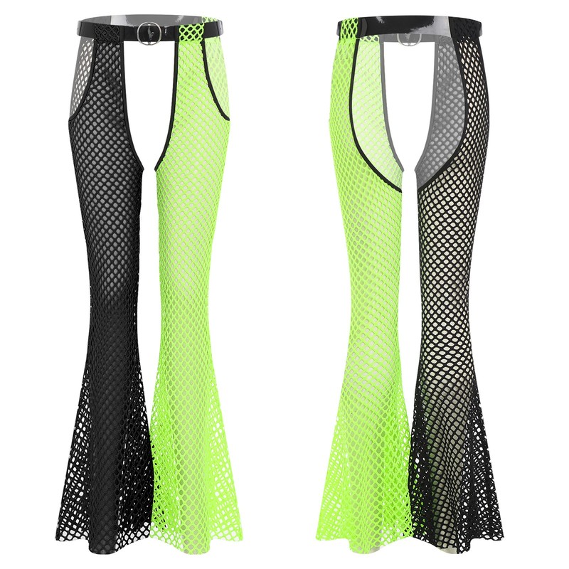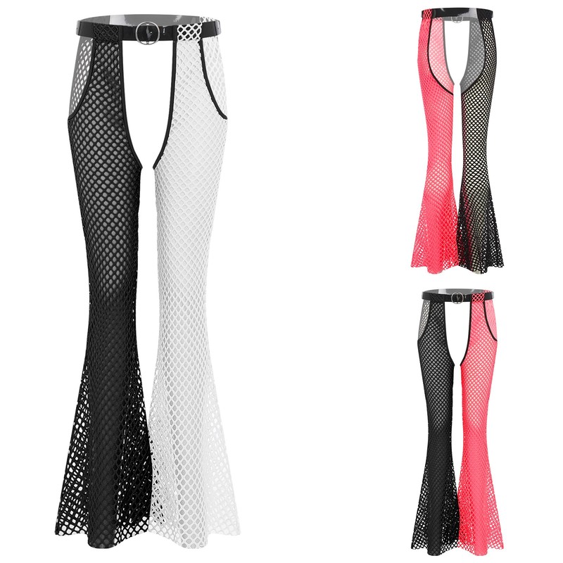 Womens Fishnet Mesh Chaps Hollow Out Crotch Wide Leg Pants Trousers for Clubwear