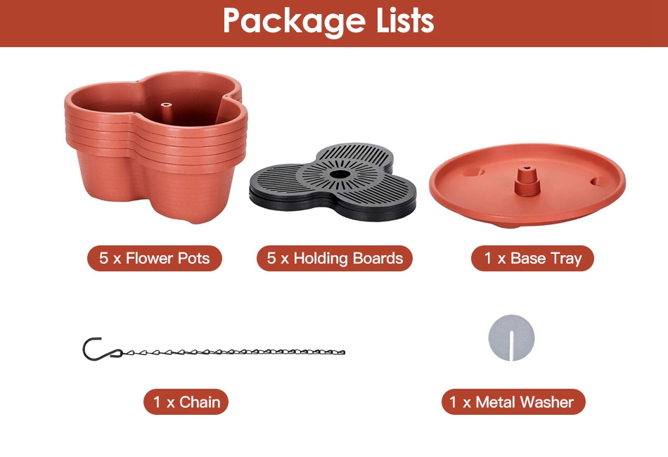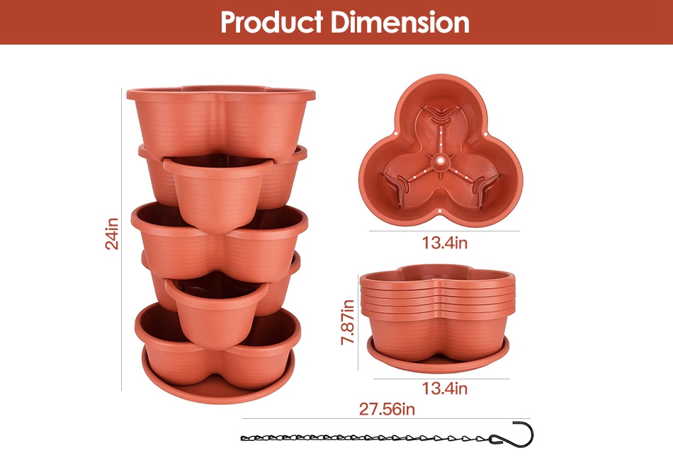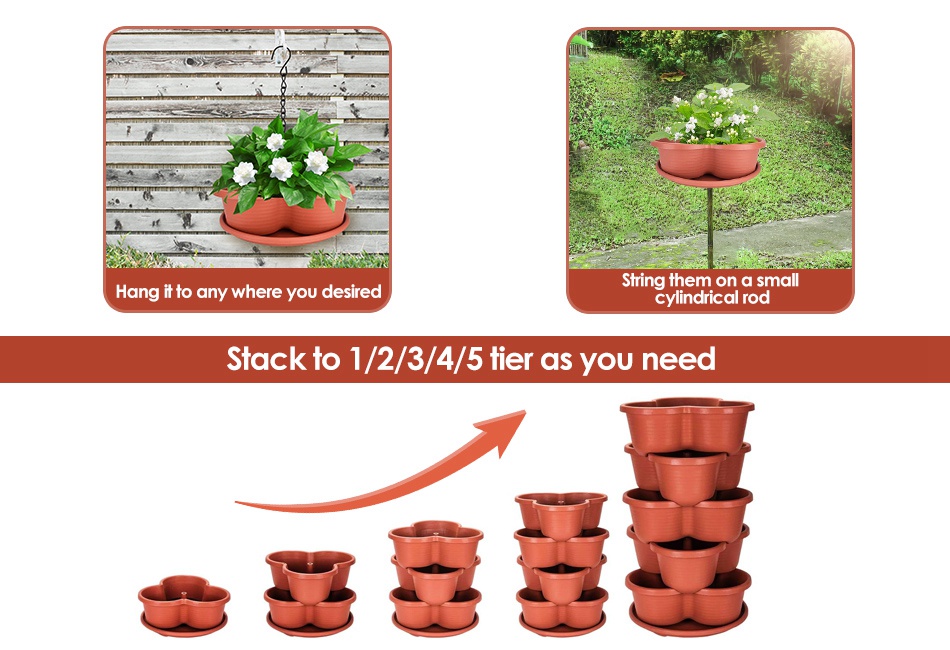 - Different Combinations:Thanks to the special stackable design,you can stack these 5 flower pot as you desired. You can stack it to 2/3/4/5 tier as you need. Besides,you can also hang it to anywhere you like with the included hanging chain and metal washer,or string them on a small cylindrical rod.