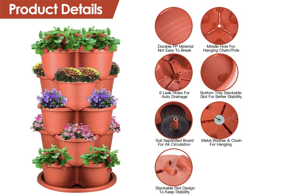 Do you want to create a small flower/vegetable garden of your own on the balcony and want to have a good harvest at home in all seasons? Our 5-tier stackable planter is a best choice for you! Vertical design makes it occupy small space but can grow more plants/flower! Each flower pot features 6 drainage holes on the bottom, which allows the excess water to leak to the lower flower pot automatically, great to keep your plants/flowers moisture as well as conserve and retain water. Besides, the bottom tray can keep your floor dry and clean. You can stack it to 2/3/4/5 tier as you need, hang it to anywhere, or string them on a small cylindrical rod for use. Take it home now and grow your favorite plants, flowers, fruits, vegetables and other herbs you want!