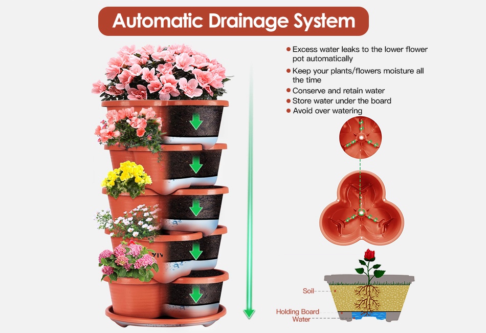 - Special Watering Design:Each flower pot features 6 drainage holes on the bottom,which allows the excess water to leak to the lower flower pot automatically,great to keep your plants/flowers moisture as well as conserve and retain water. Besides,the bottom tray can keep your floor dry and clean.