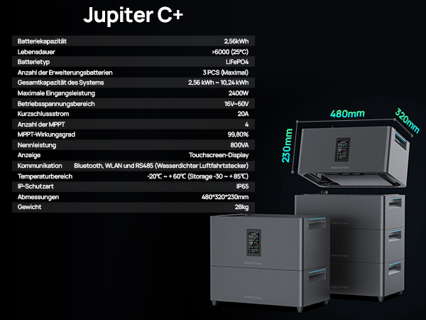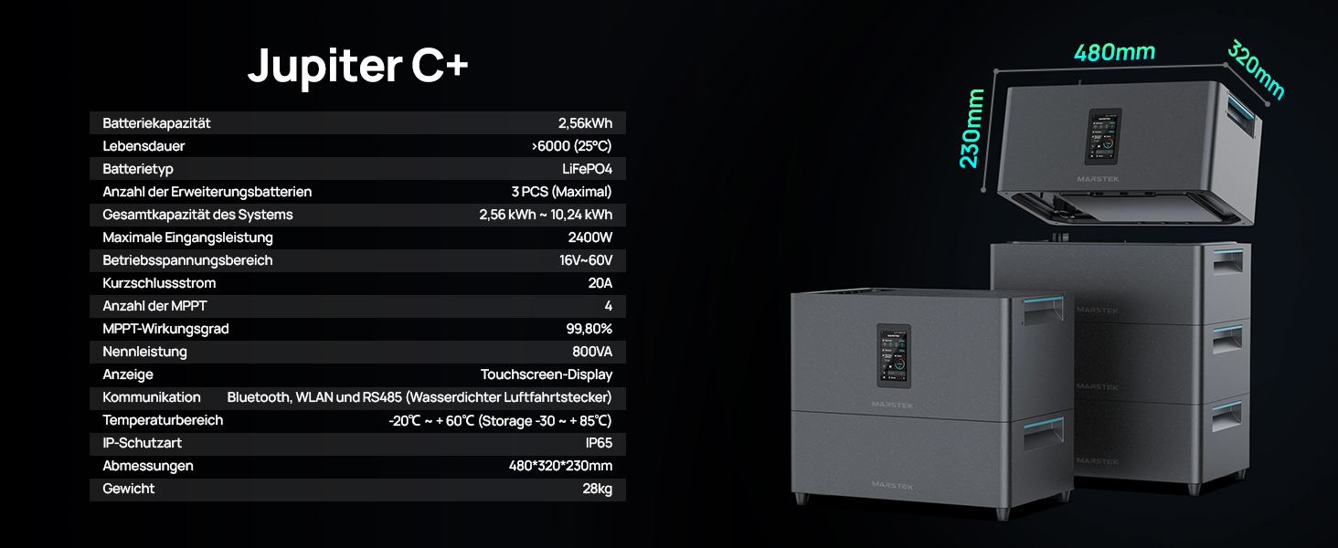 Jupiter C+ hat eine Einzelkapazität von 2,56 kWh und kann mit bis zu drei Erweiterungsbatterien auf 10,24 kWh erweitert werden. Decken Sie ganz einfach den Energiebedarf Ihres Haushalts und genießen Sie mehr Flexibilität und Möglichkeiten bei der Energieversorgung!