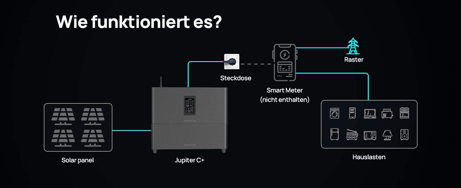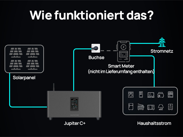 Jupiter C+, 1× 3 m Wechselstromkabel mit Schuko-Stecker, 4× 430-Watt-Solarmodule,4x 2 m Kabel mit Doppelstecke Bedienungsanleitung. Die Solarmodule und das All-in-One-Gerät werden in separaten Lieferungen versandt.
