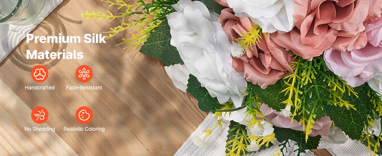 A 3: Each bouquet is handcrafted from high-quality silk fabrics that are tightly secured to prevent peeling. They can be used both indoors and outdoors.