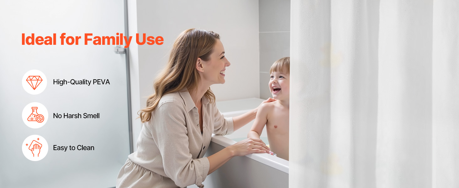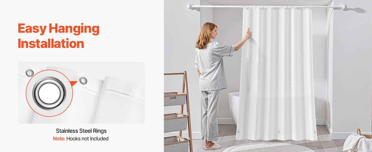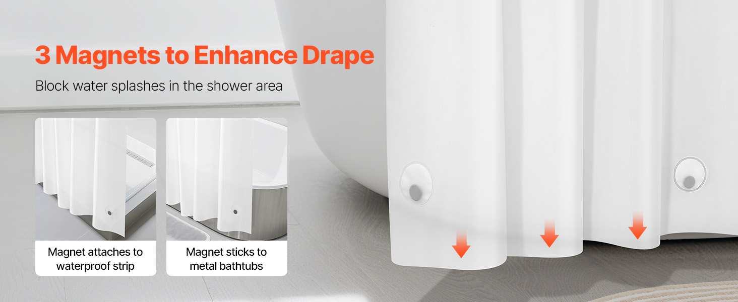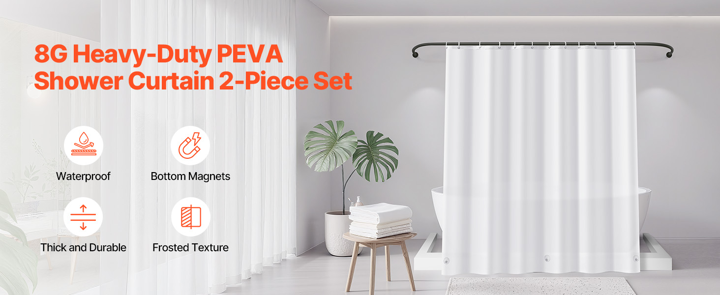 This durable 8G PEVA shower curtain is designed with superior water resistance and a sleek surface that helps water slide off effortlessly. The bottom hem is weighted with magnets, making it suitable for use with metal bathtubs. Its frosted finish provides a soft touch while enhancing privacy. Please note that this curtain is not machine washable, and hooks are not included.