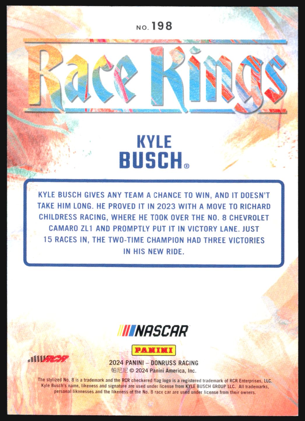 | 2024 Donruss Race Kings KYLE BUSCH Pink /25 #198 | ||||||||||||||||||