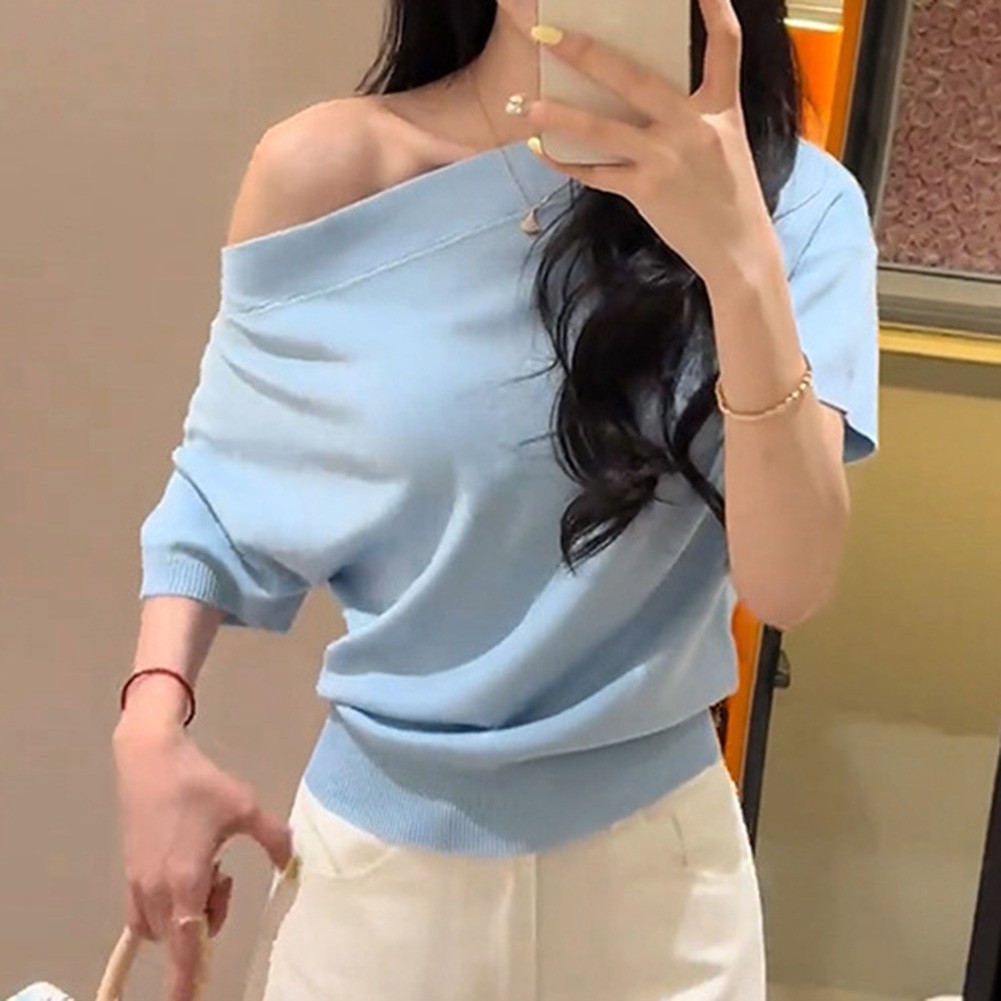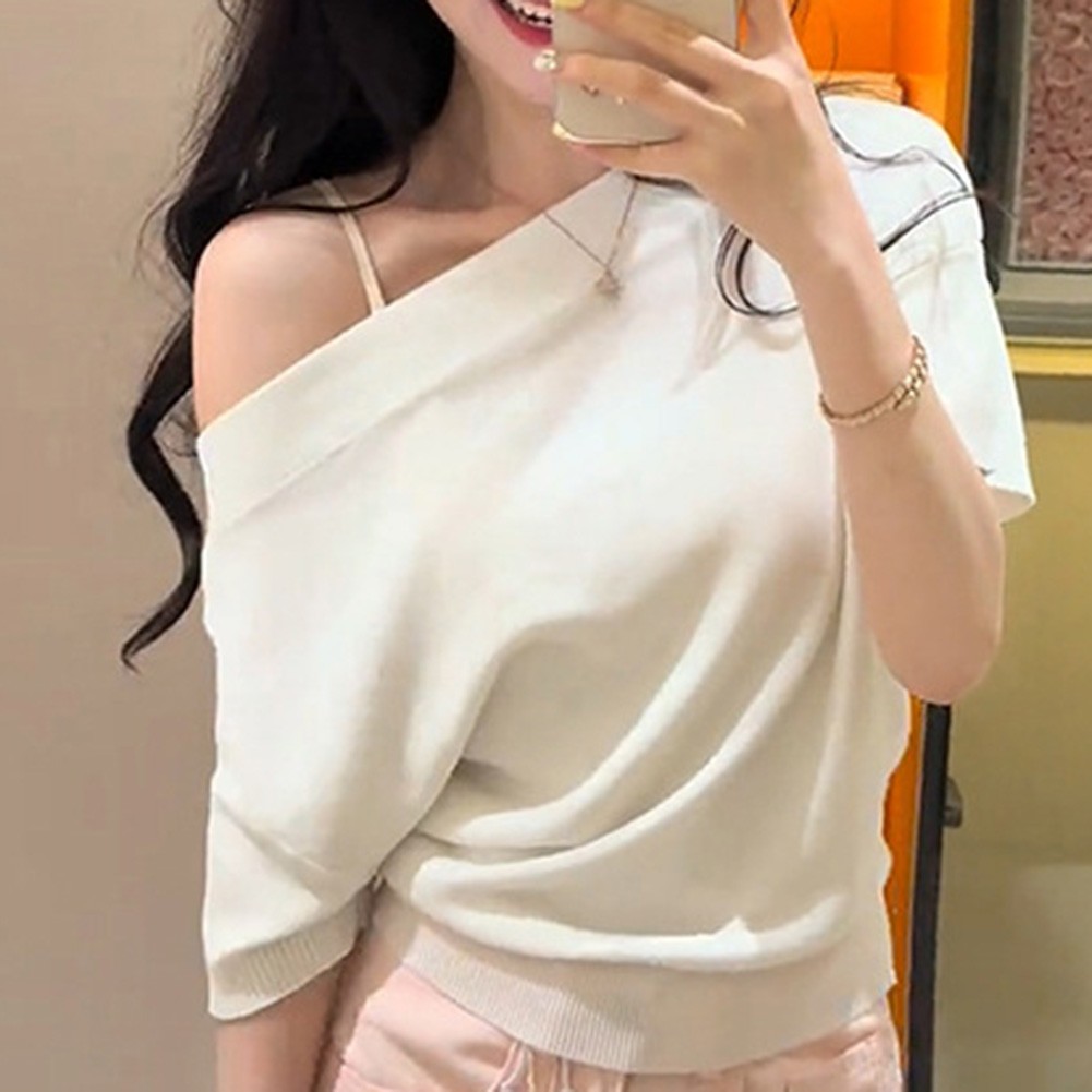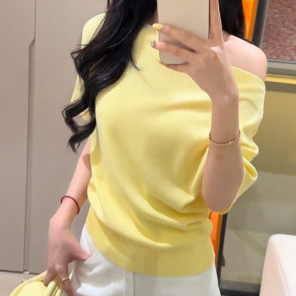 * Caractéristiques de l'article :T-shirt tricoté à manches courtes à épaules dénudées couleur unie été pour femmes, haut à la mode pour filles chaudes
