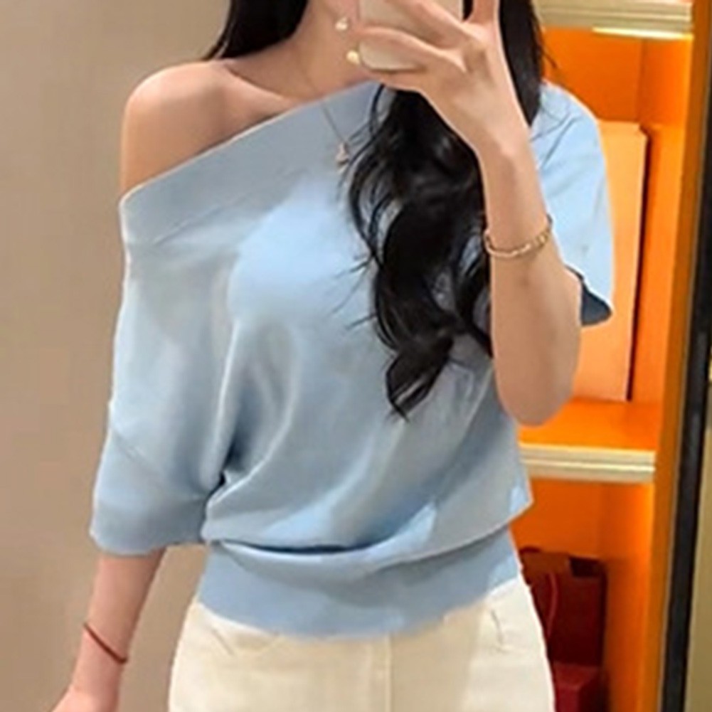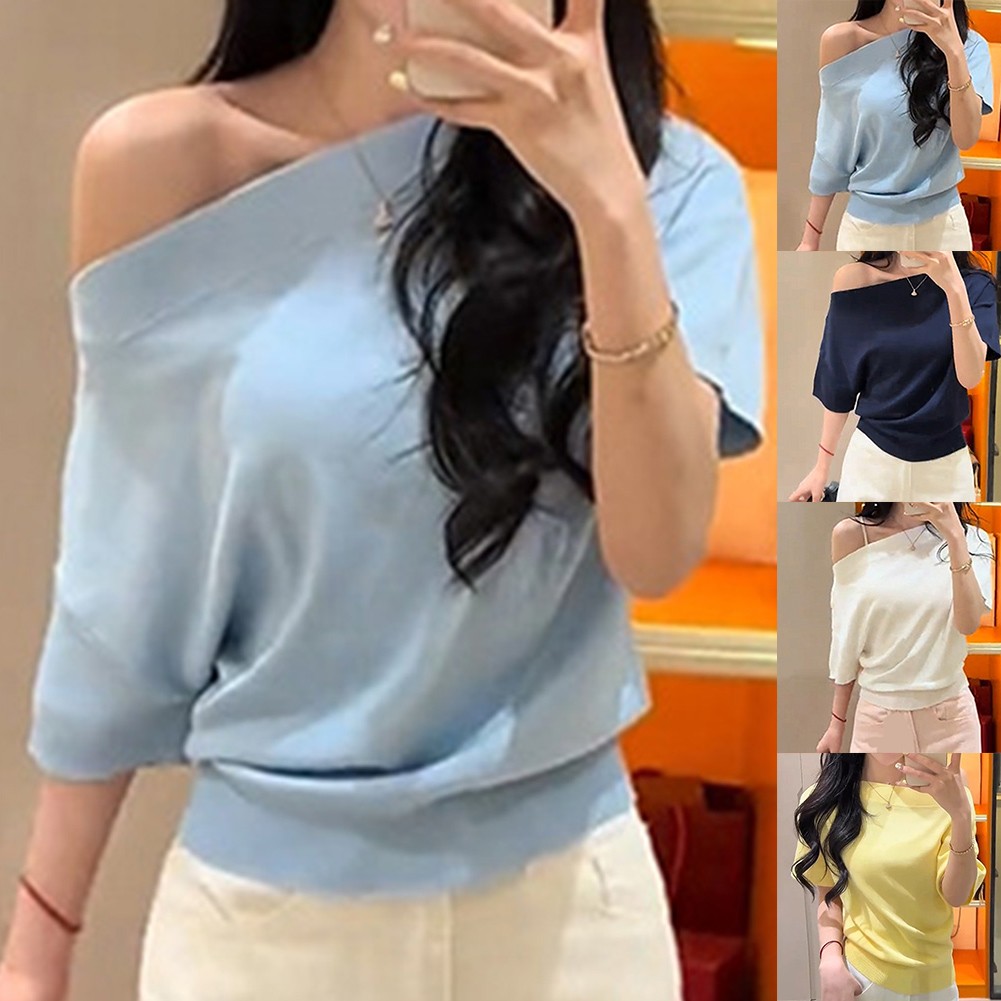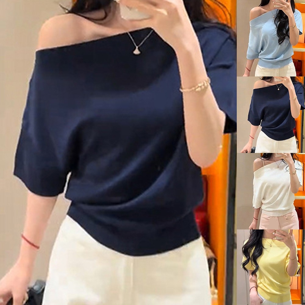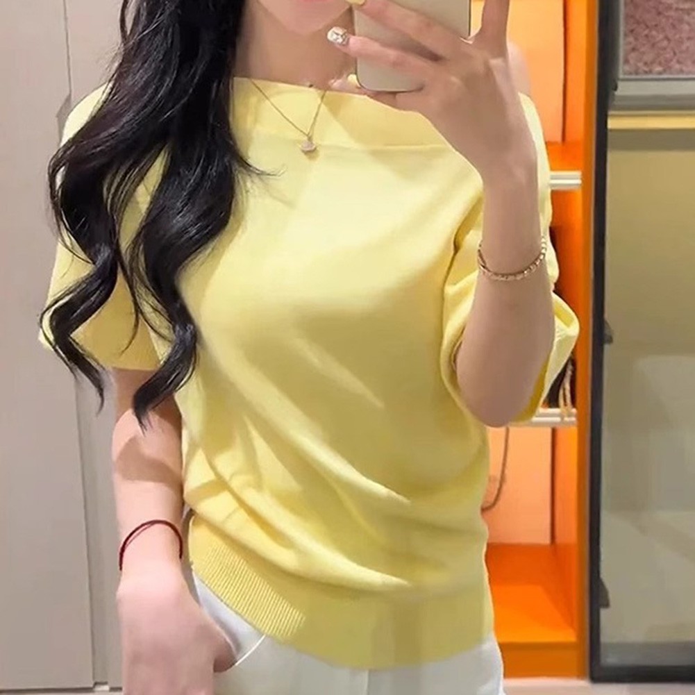 * Caractéristiques de l'article :T-shirt tricoté à manches courtes à épaules dénudées couleur unie été pour femmes, haut à la mode pour filles chaudes