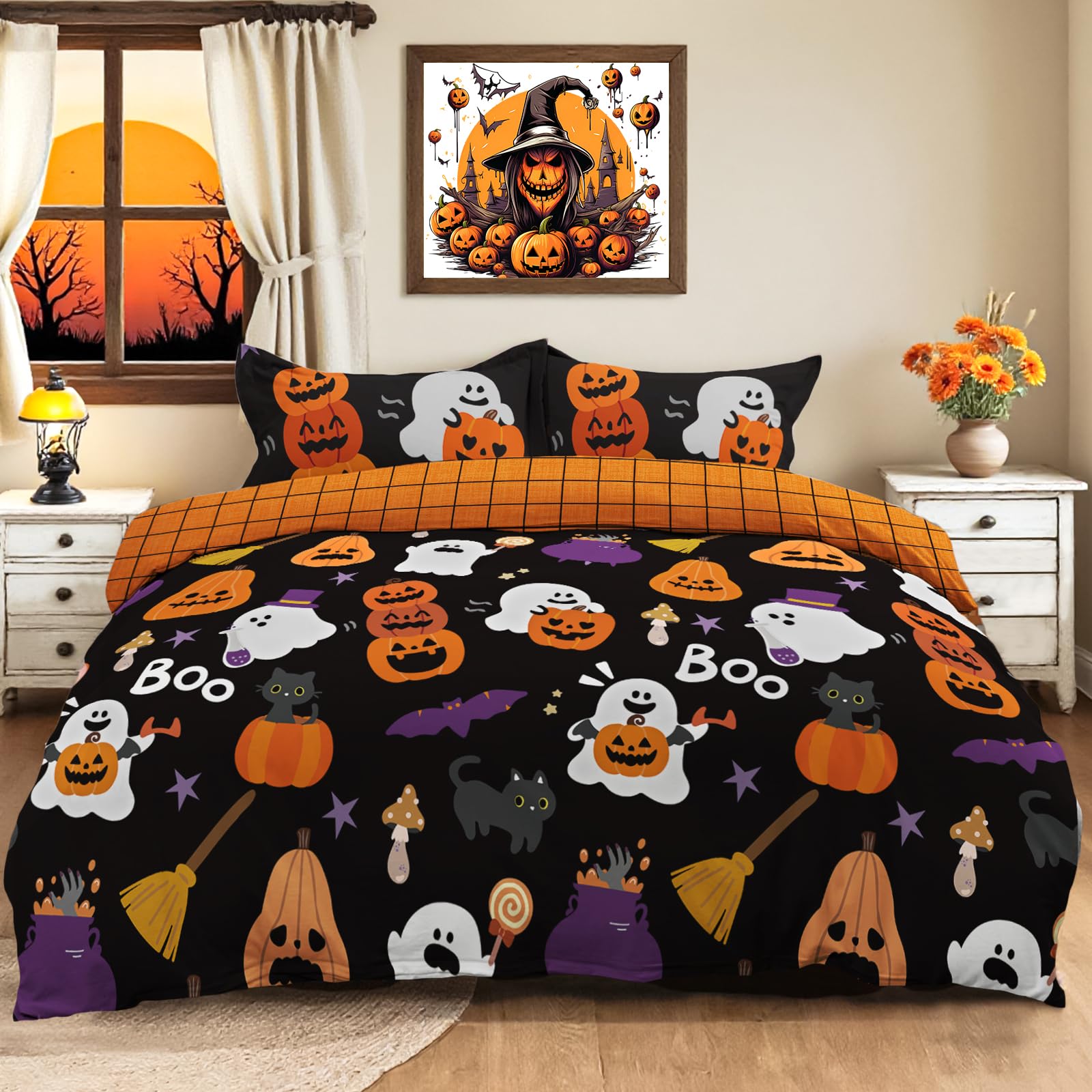 Complete 3-Piece Set: 3 pieces Halloween queen size beddding set includes 1 duvet cover 90x90 Inch and 2 pillowcases 20x26 Inch. Please note: comforter and pillows are not included.