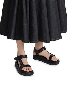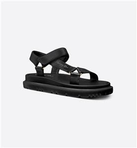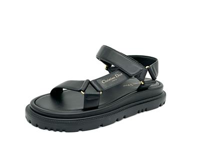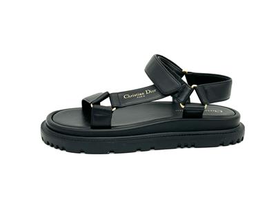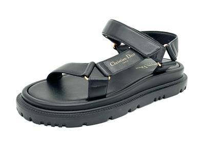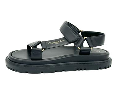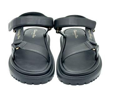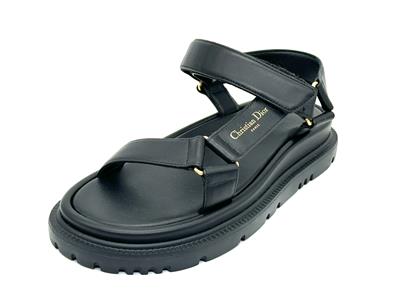 Dior's D-Wave lambskin leather sandals with a gold-tone Christian Dior Paris signature. The adjustable scratch band ensures a perfect fit, while the notched EVA sole with a star, Christian Dior's lucky symbol, provides both style and comfort. It is completed by a thick, ultra-lightweight and comfortable rubber sole.