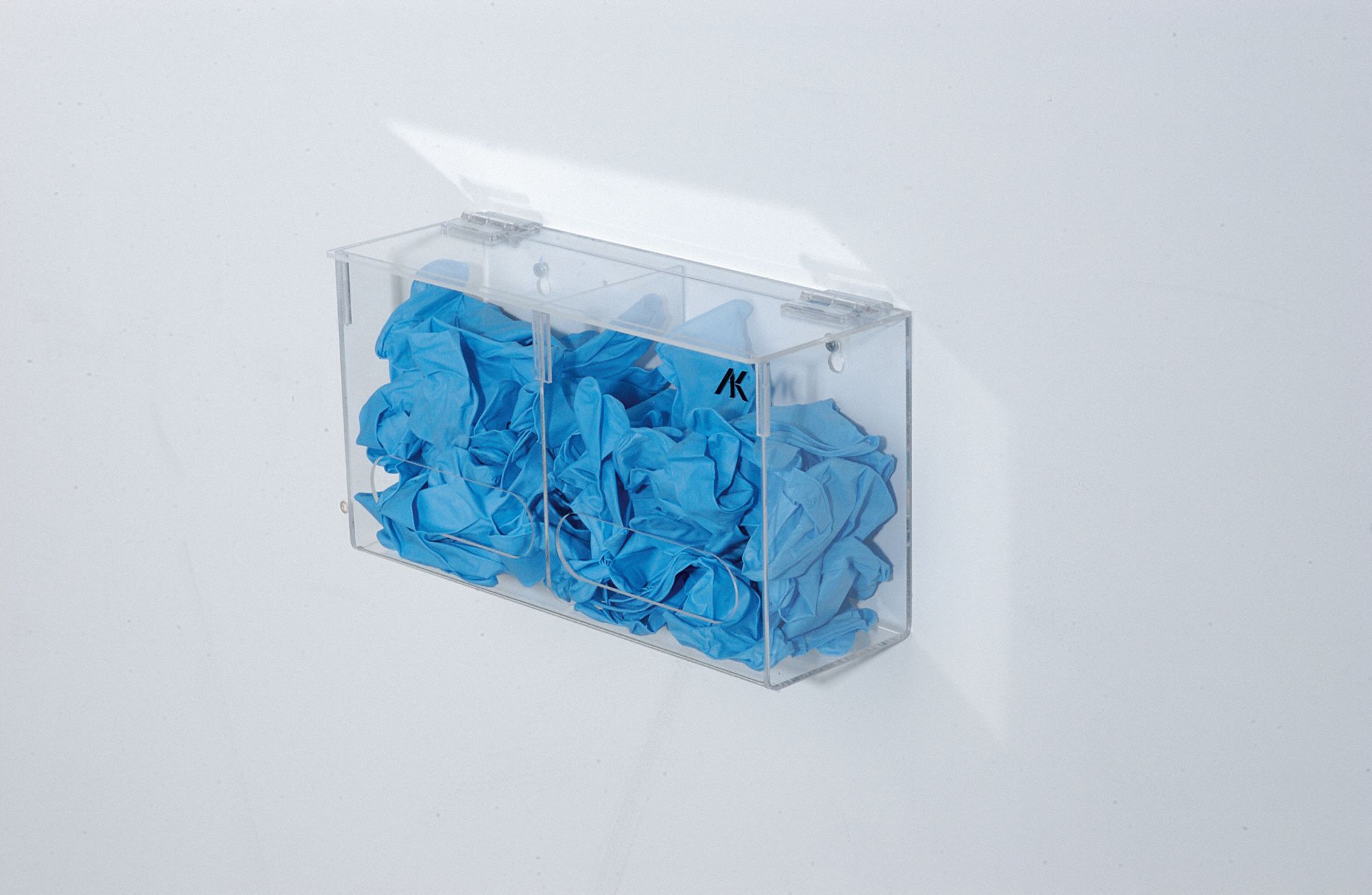 Bulk Glove Dispenser, Dimensions 7 in H x 13-1/4 in W x 4-1/2 in D, Dispenser Layout 2 Compartments, FDA Compliant Yes, Fill Direction Top Load, Glove Dispenser Type Controlled Environment, Food Service, General Purpose, Dispenser Contains Bulk Gloves, Color Clear, Depth 4 1/2 in, Height 7 in, Material PETG Plastic, Width 13 1/4 in, Holder Mount Location Wall