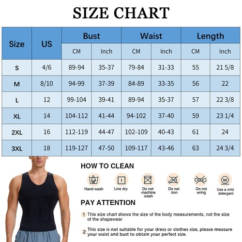 【HOW TO WEAR】Pull up the mens body shaper from underneath and take off the same way, which will help to tighten your armpits with a little bit tight when first time wear it. Will get used to the vest wearing a few times. We suggest you try prolong the time of wearing, find it a worthy buying experience.