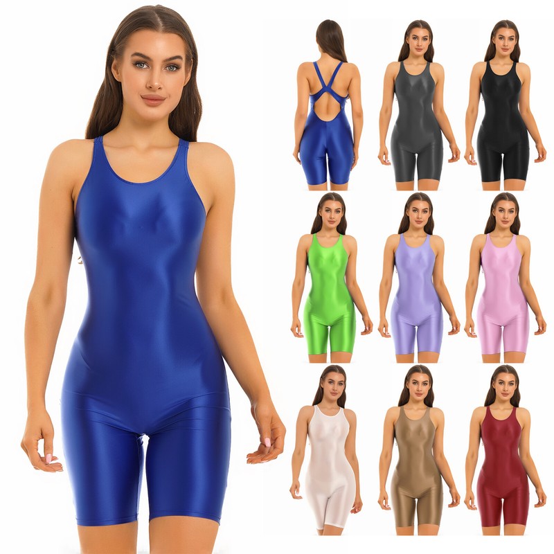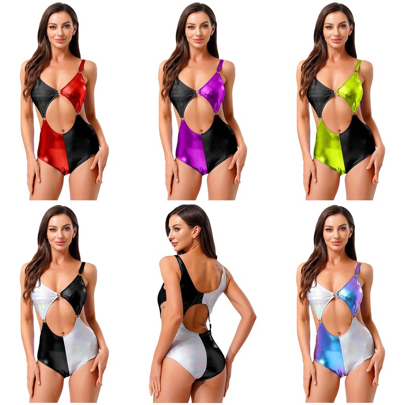 Women's Metallic Shiny Contrast Color Sleeveless Bodysuit Sling Leotard Swimsuit