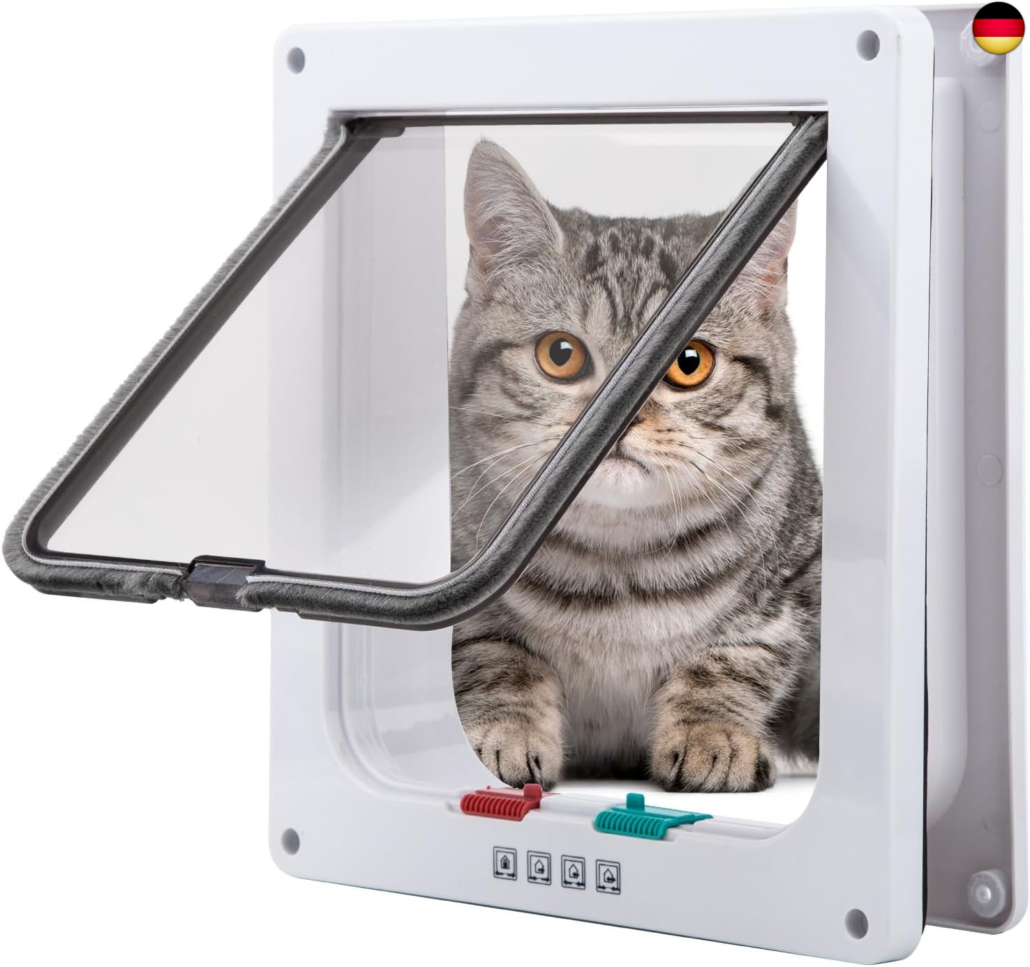 Katzentür mit 4-Wege-Funktion -- Die Caterpillar Klappe kann über die roten und grünen Schalter mit Beschriftung auf 4 Betriebsarten eingestellt werden: Out, In, In und Out und Vollverriegelung.