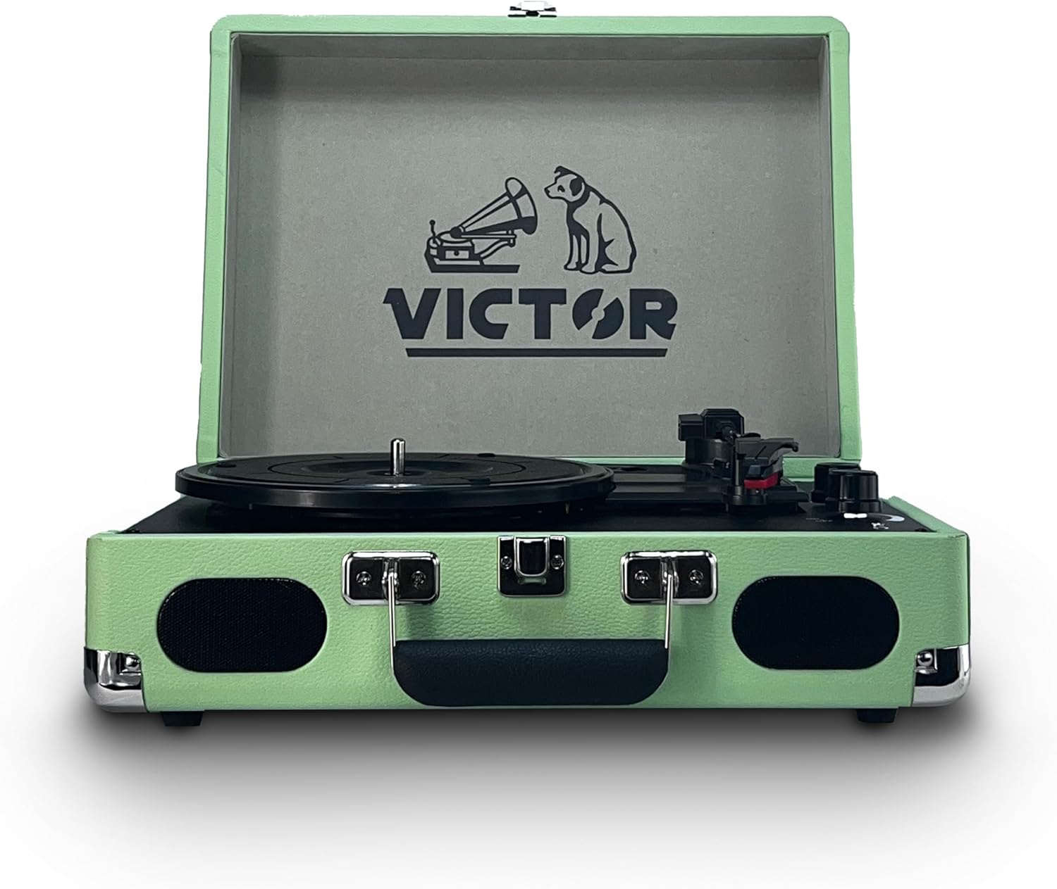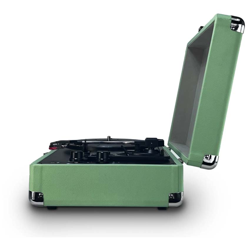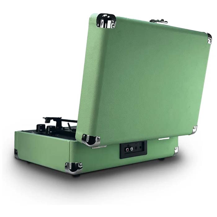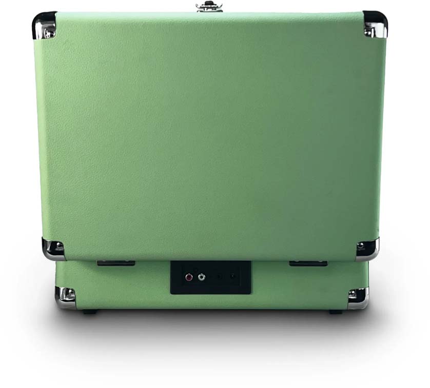 ADDITIONAL FEATURES: Secure case latch, Corner protectors, Auto stop control, Speed selector (33.3, 45, 78 rpm), Volume control, Headphone jack, Line Out