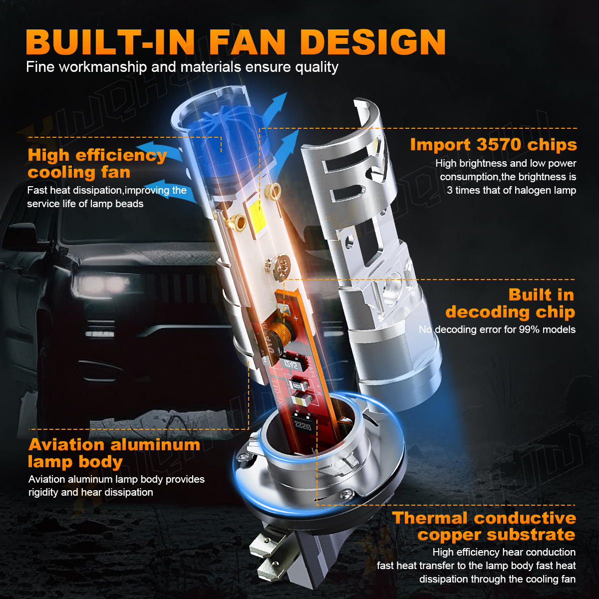 Easy to Install - The led bulbs combo are wireless, w/ fan and all-in-one design, almost the same size as the stock halogen bulbs. Non-polarity socket design, plug and play, just directly replace the original halogen bulb with our XWQHJW® LED bulbs and enjoy your drive.