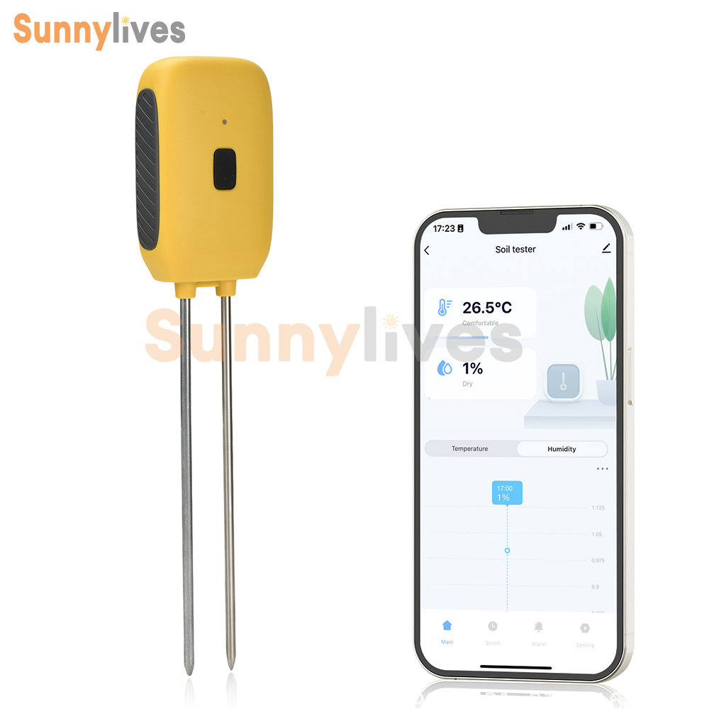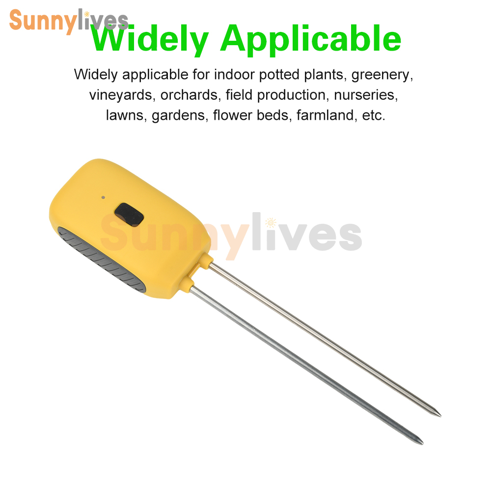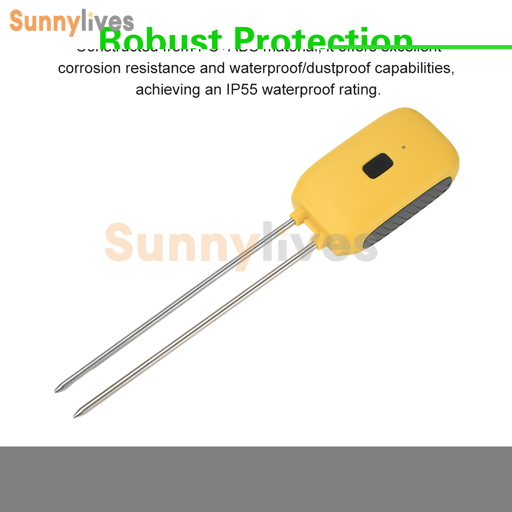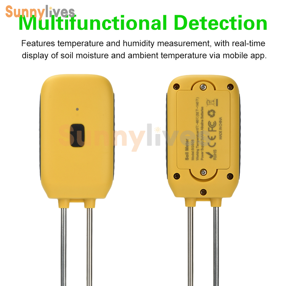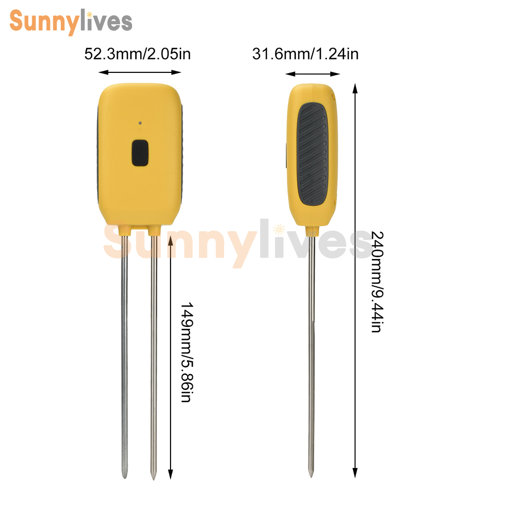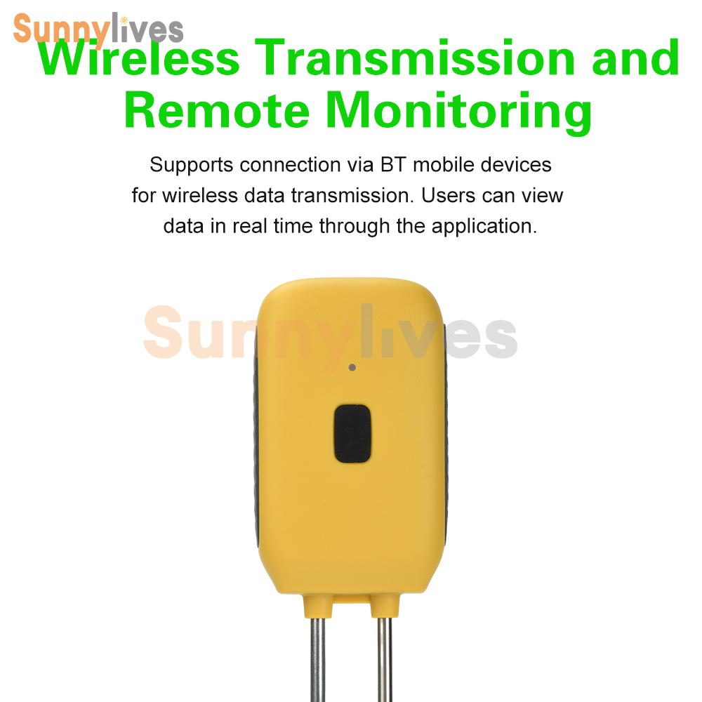 Features: 1. Simple Operation: Insert the probe approximately 3-5 inches (10 cm) into the soil, wait 10 seconds for accurate and precise readings, then remove the probe from the soil and wipe it clean after use. 2. Wireless Transmission & Remote Monitoring: Supports Bluetooth connection to mobile devices for wireless data transfer. Users can view real-time data via the app. 3. Multi-Function Detection: Includes temperature and humidity measurement. The mobile app displays soil moisture and ambient temperature during testing. 4. Durability & Protection: Constructed from PC+ABS material, offering excellent corrosion resistance and water/dustproof capabilities. Meets IP55 waterproof rating. 5. Applications: Widely applicable for monitoring soil moisture and ambient temperature in indoor potted plants, greenery, vineyards, orchards, field production, nurseries, lawns, gardens, flower beds, and farmland. Enables users to instantly understand soil conditions, resolving challenges with traditional temperature/humidity readings.
