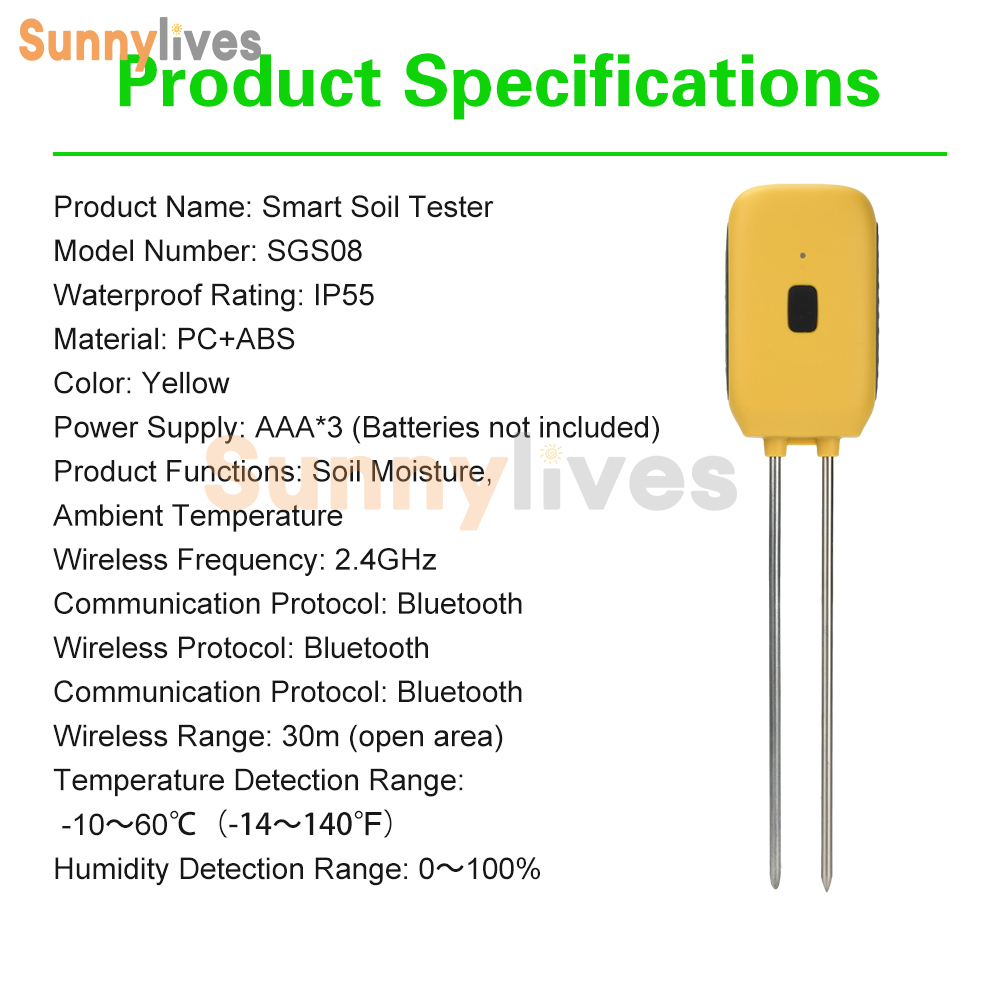 Product Specifications: Product Name: Smart Soil Monitor Model Number: SGS08 Waterproof Rating: IP55 Material: PC+ABS Color: Yellow Power Supply: AAA*3 (Batteries not included) Functions: Soil Moisture, Ambient Temperature Wireless Frequency: 2.4Ghz Communication Protocol: Bluetooth Wireless Protocol: Bluetooth Communication Protocol: Bluetooth Wireless Range: 30m (open space) Temperature Range: -10~60℃ (-14~140℉) Humidity Range: 0~100%