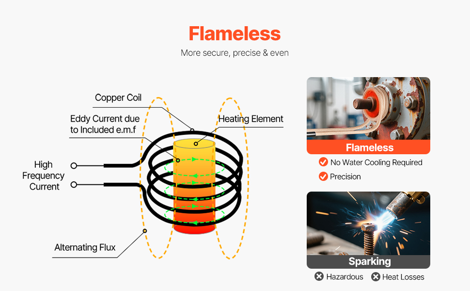 Quick Disassembly: High-frequency electromagnetic field heating with 1100W of power allows the metal to quickly expand within 30 seconds, making it easy to remove. The induction heater produces no flames, requires no water cooling