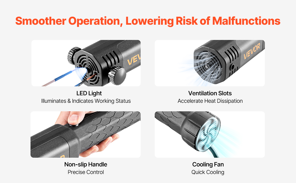 The heat dissipation design has been upgraded, with multiple ventilation holes and an internal cooling fan to prevent frequent overheating. The bright LED light helps you work smoothly in the dark and serves as a reminder not to touch the coils. The textured handle is non-slip for comfortable use.