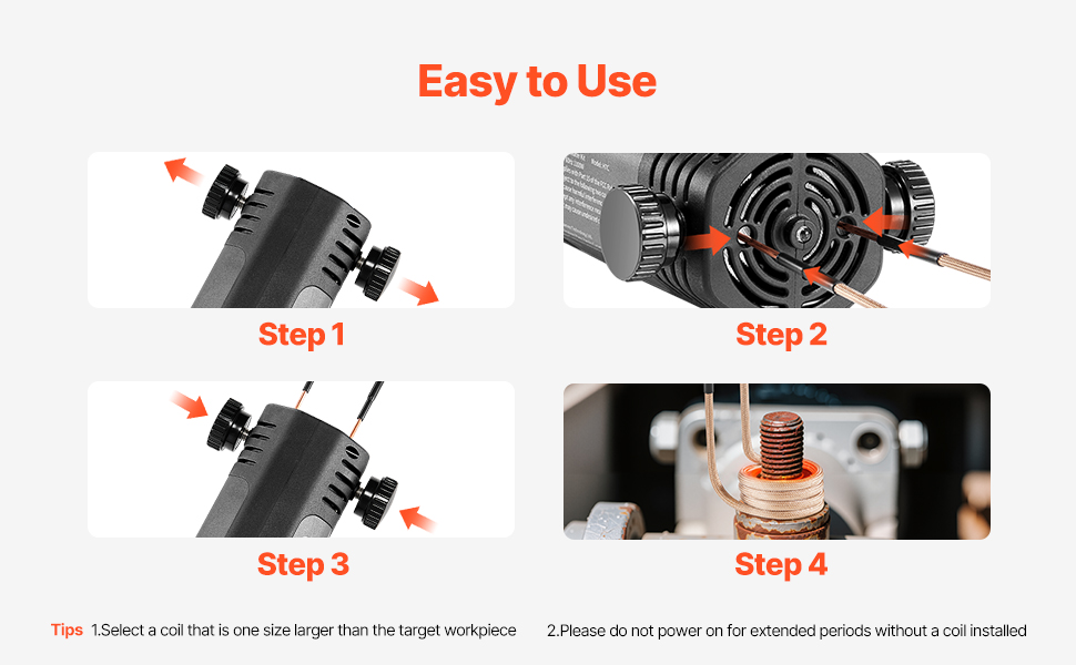 Simply loosen the two side nuts on top to easily replace the coils. The induction bolt heater tool locks securely and is not easy to loosen.