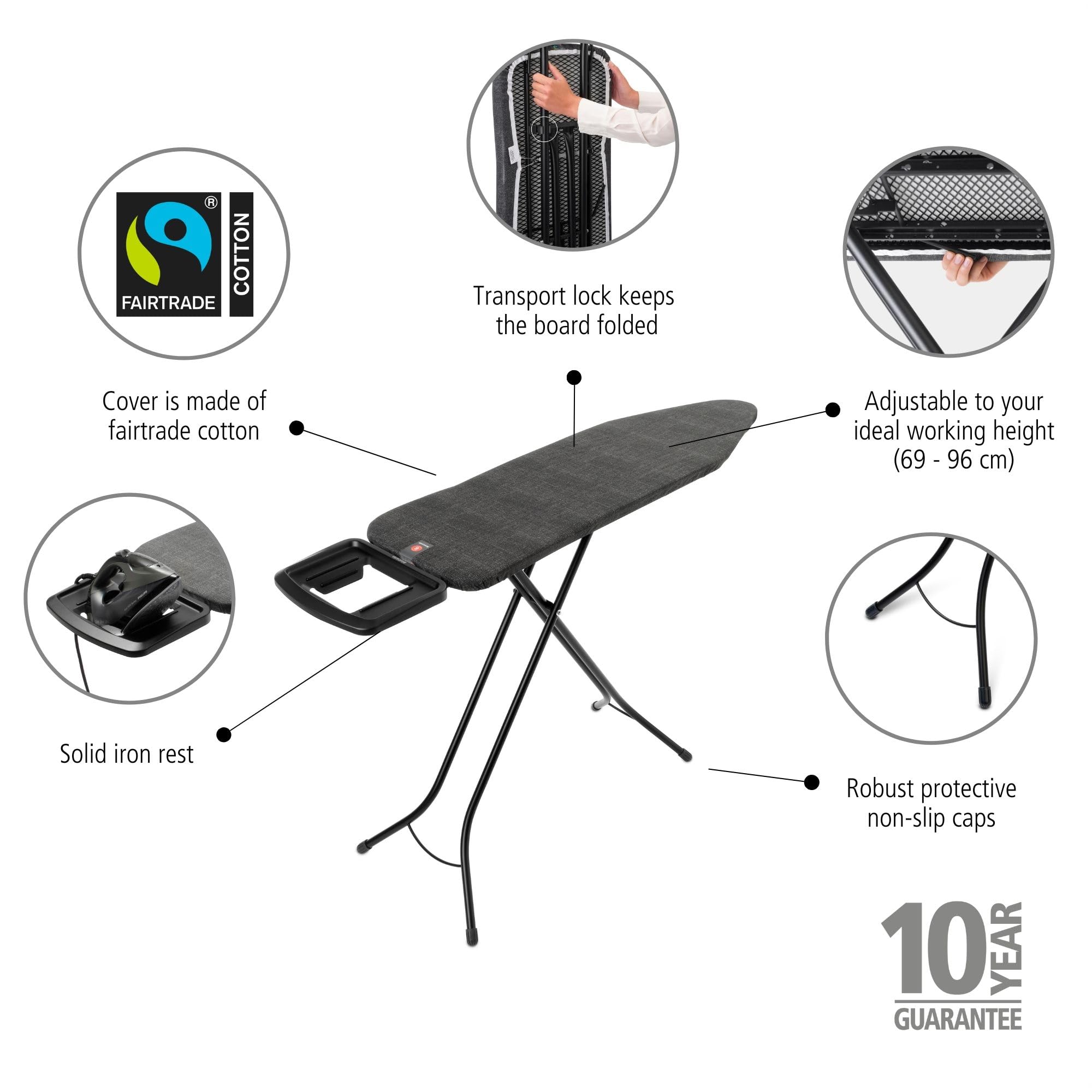Brabantia Asse da stiro B, 124x38cm - Denim Black | 100% Cotone Fairtrade | Telaio stabile e antitraballamento | Pieghevole, altezza regolabile, solido poggiaferro | Certificato Fairtrade e C2C
