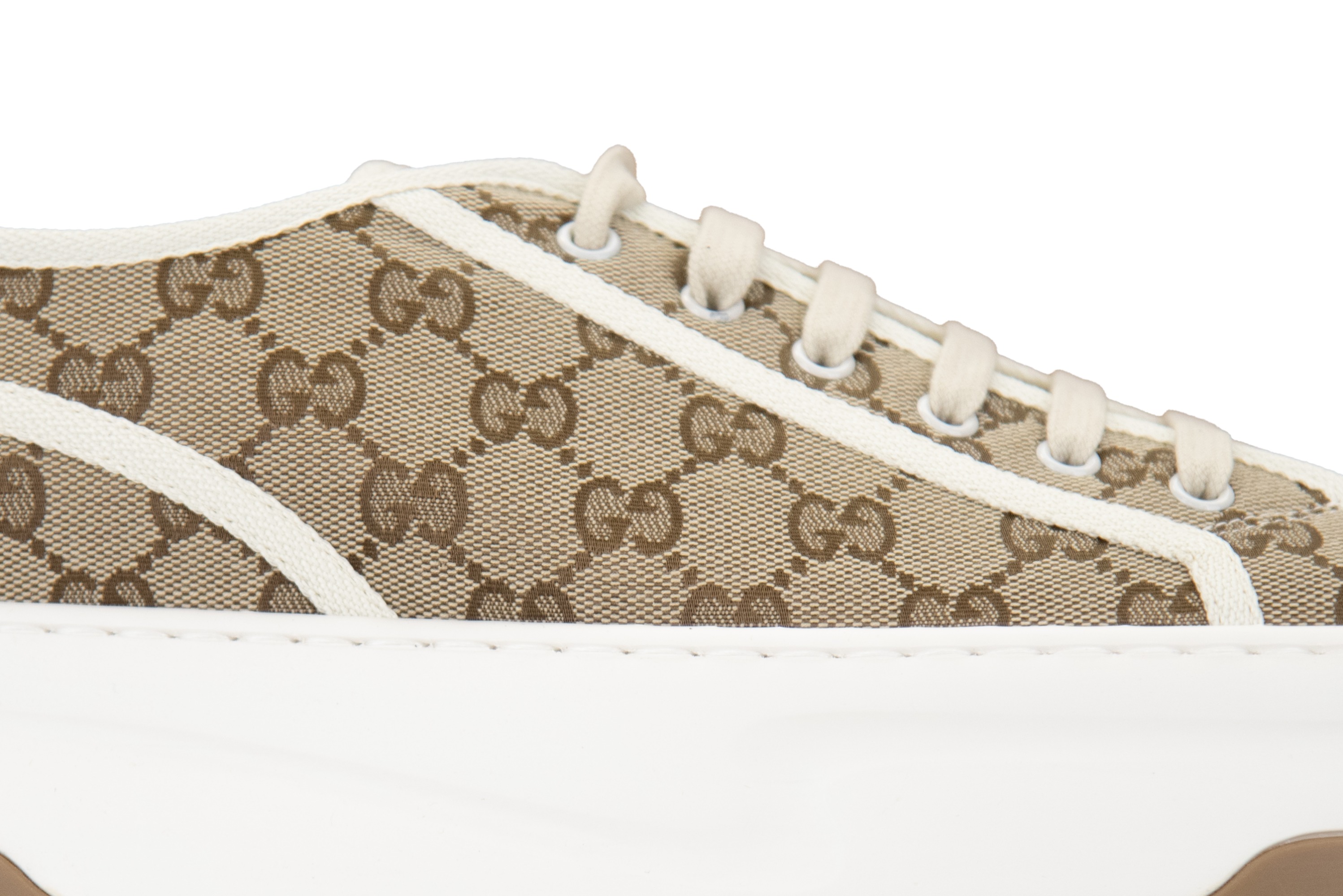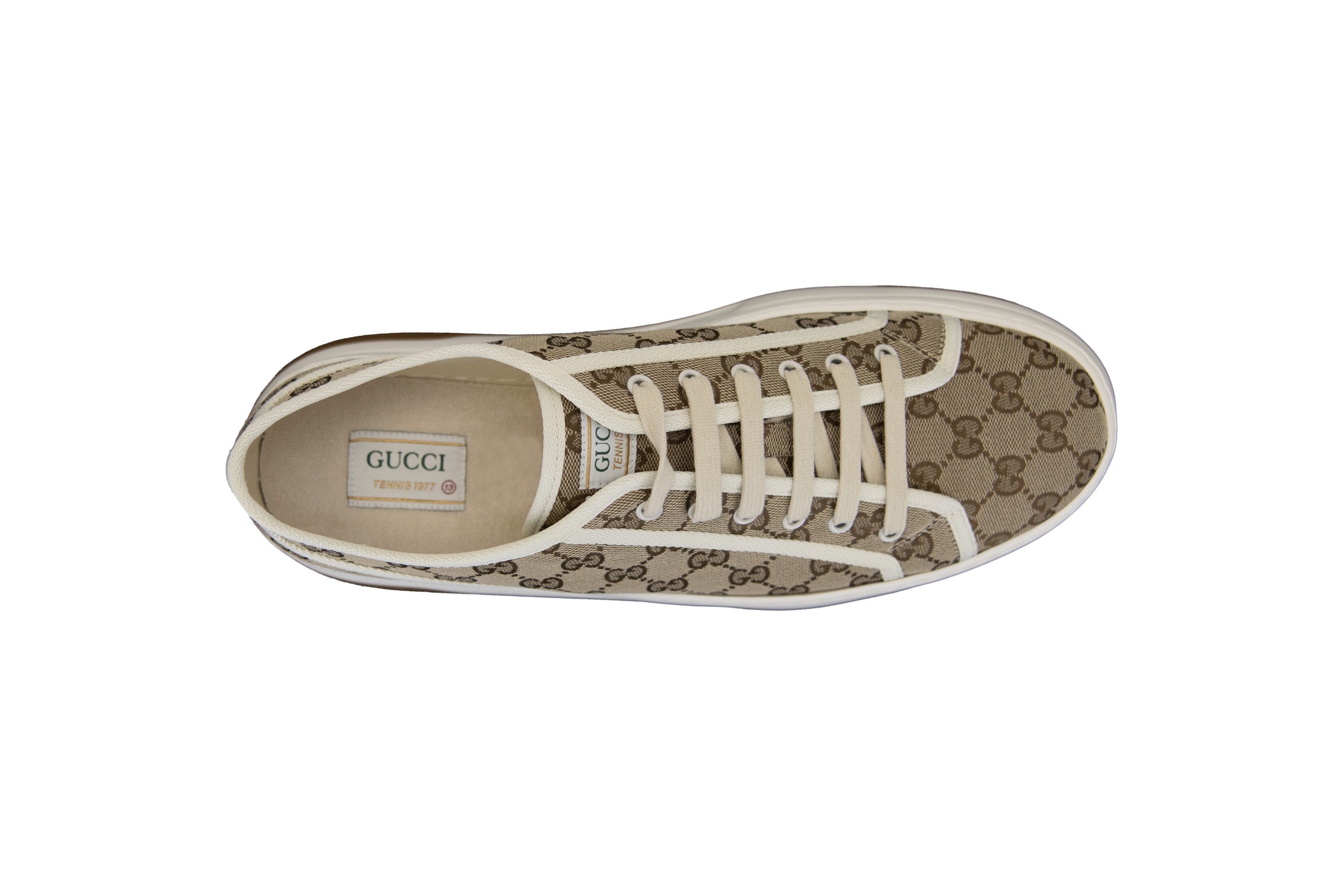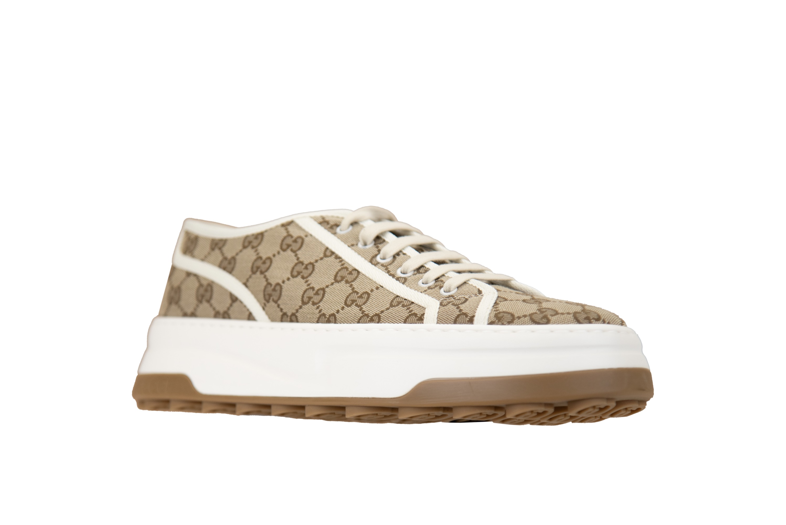 Men's sneakers by Gucci. Upper made of fabric, featuring 'GG' pattern made in contrasting pattern. Round toe. Fabric-lined interior. Insole, non-removable, with stitched logo patch. Thin fabric tongue, embellished with stitched logo patch. Durable rubber sole, features 'GG' grommets as an elevation. Made in Italy