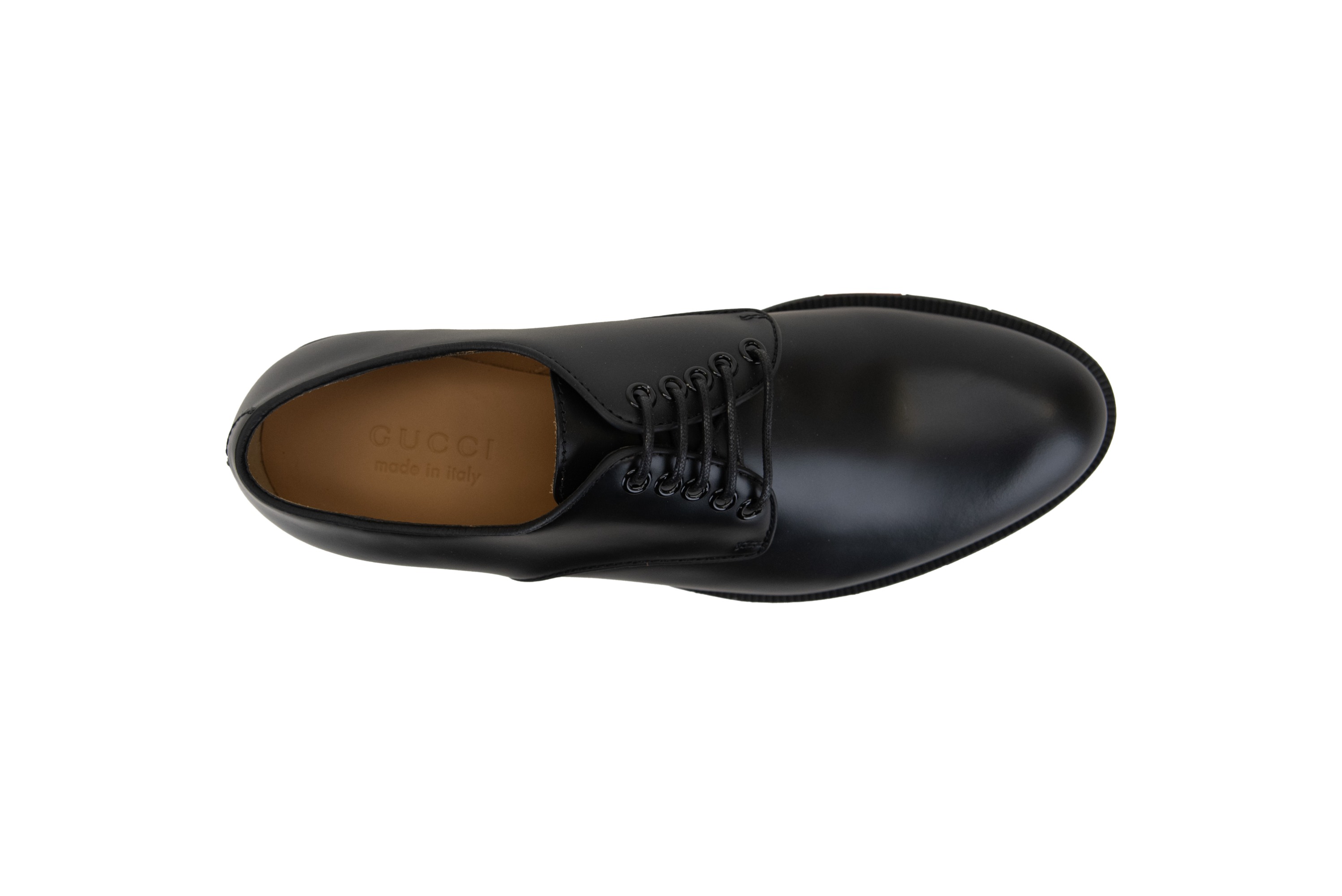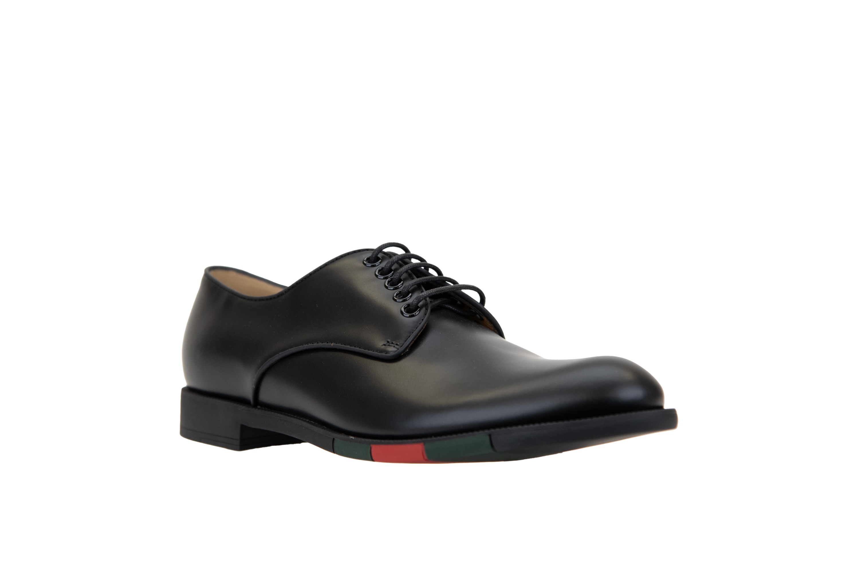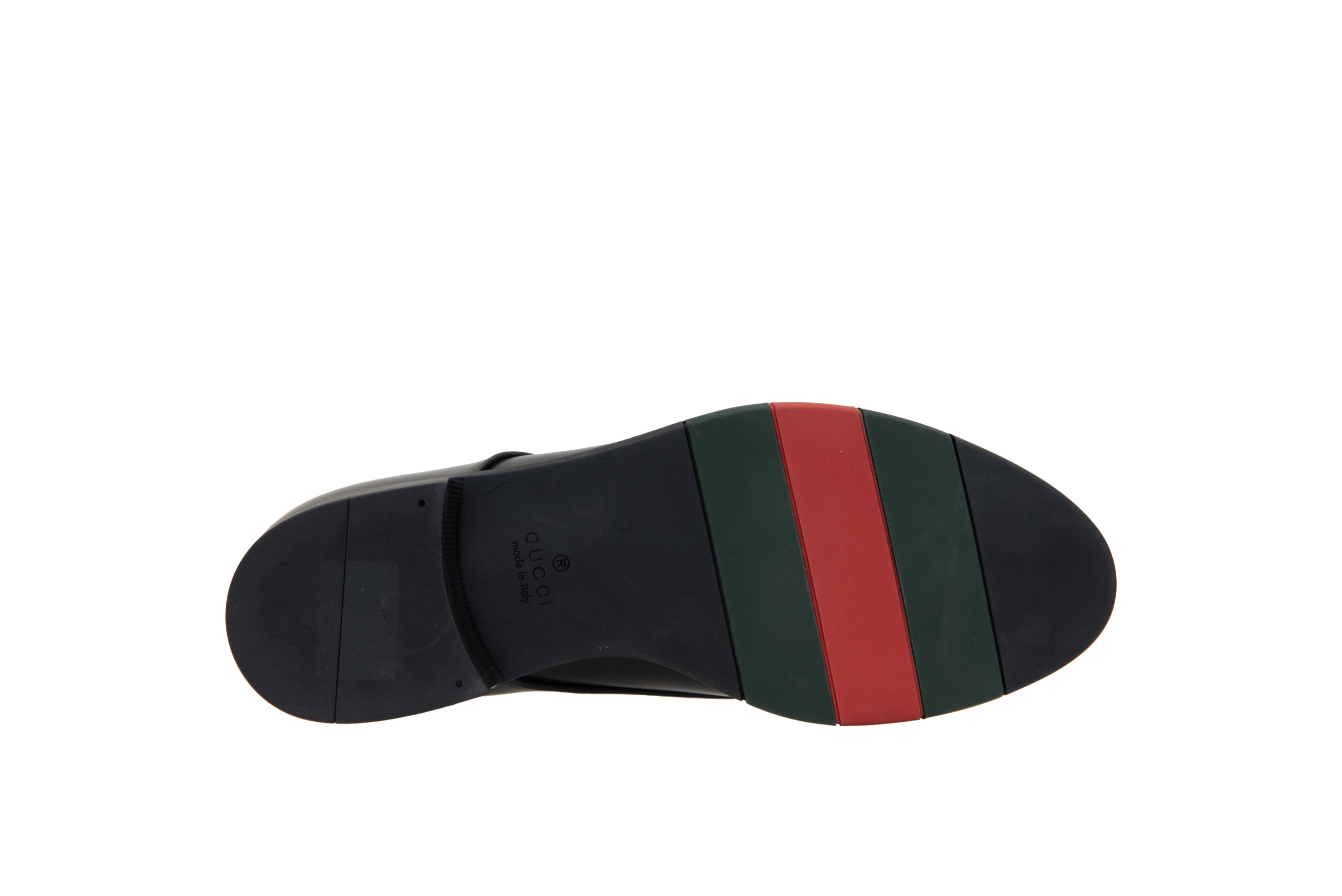 Elegant men's shoes by Gucci. Upper made of leather. Round toe. Interior made of leather, with suede back at heel height. Insole made of leather, featuring branded brand lettering. Sole made of durable rubber, featuring banded detail with iconic brand colors. Made in Italy.