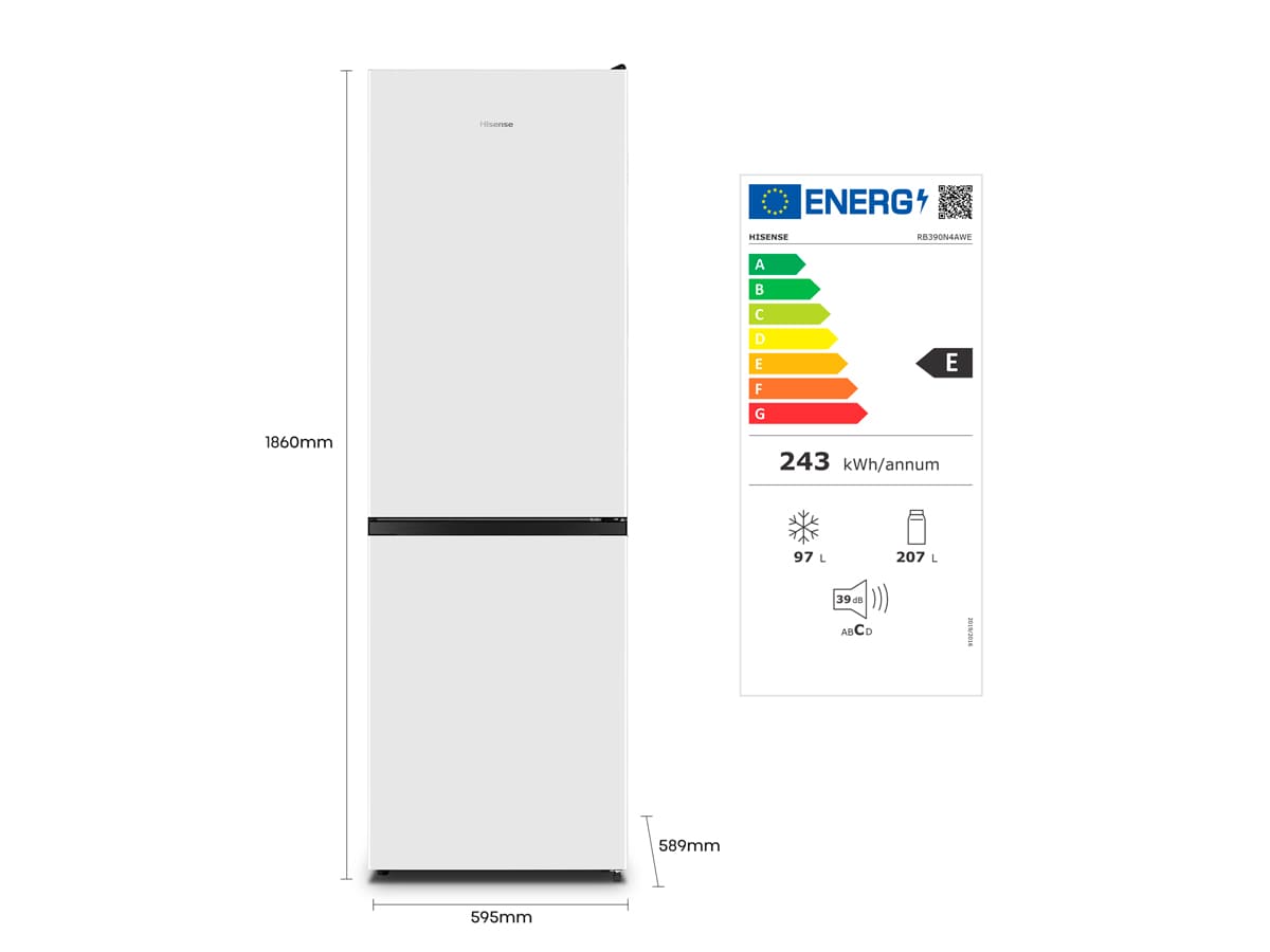 Hisense RB390N4AWE. Capacità netta totale: 304 L. Cerniera porta: Destra, Tipo di display: LED. Classe climatica: SN-N, Emissione acustica: 39 dB. Capacità netta frigorifero: 207 L, No Frost (frigorifero), Sistema Multi-Airflow (frigorifero), Luce interna. Capacità netta congelatore: 97 L, Capacità di congelamento: 6 kg/24h, No Frost (congelatore). Classe efficienza energetica: E, Consumo energetico annuo: 243 kWh. Colore del prodotto: Bianco