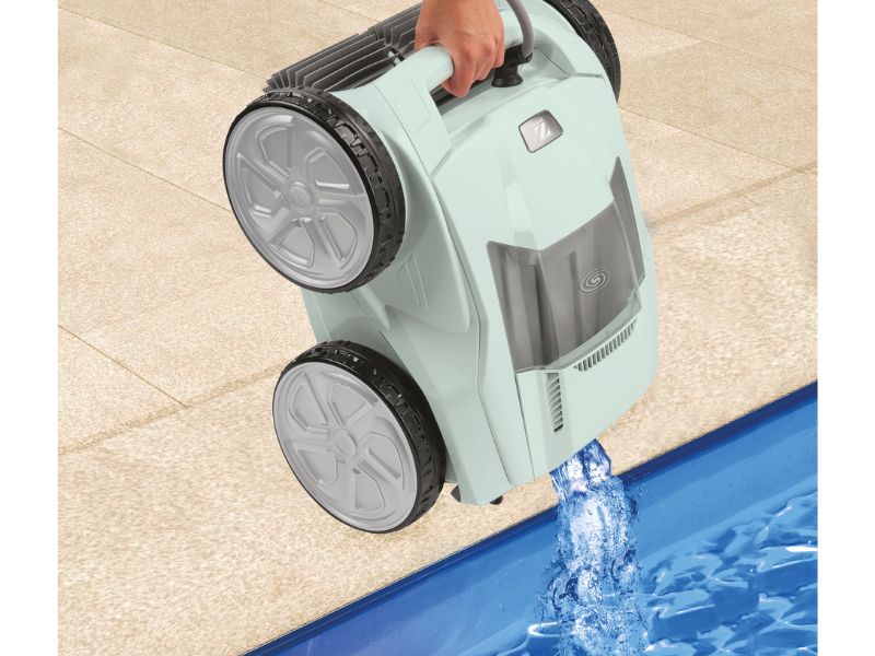 Der ZODIAC Alpha 63 iQ Biopoolroboter steuert durch das patentierte Lift-System zur gewünschten Beckenwand und erklimmt diese. Bei Erreichen der Wasseroberfläche stößt der ZODIAC Alpha 63 iQ vollautomatisch das in dem Biopoolroboter befindenden Wasser aus der Rückseite wieder aus. Anschließend kann der Biopoolroboter ganz einfach aus dem Wasser entnommen werden, wobei das Reiniger Gewicht erheblich reduziert und so eine sehr einfache Handhabung gewährleistet ist.