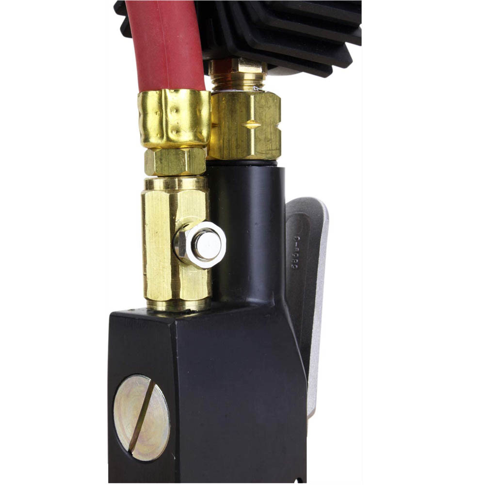 Milton is the only digital Inflator gauge you need. Milton's industrial-grade, Made in the USA, S-531 straight head air chuck compact Inflator gauge is perfect for everyday personal and professional use. Made with corrosion-resistant, anodized aluminum body for long-term use. It offers high caliber accuracy and performance-tested assurance. Bright, built-in backlight and large, 2.5" dial for a quick, accurate reading in any lighting. Added Safety features of a 300 PSI rated, 1/4" x 15"L rubber hose provides a safe working distance. The shorter-designed pneumatic Inflator is perfectly equipped with a 360-degree swivel digital pressure gauge to move with you for maximum viewing. The rubber boot protects your car's cherished rims from unsightly scratches. Accuracy: 0.5 PSI. Pressure Range: 0-255 PSI. Measurement Units: kPa (0-1800), kg/cm2 (0-18) and Bar (0-18). 3 volt. Air inlet: 1/4" NPT female.