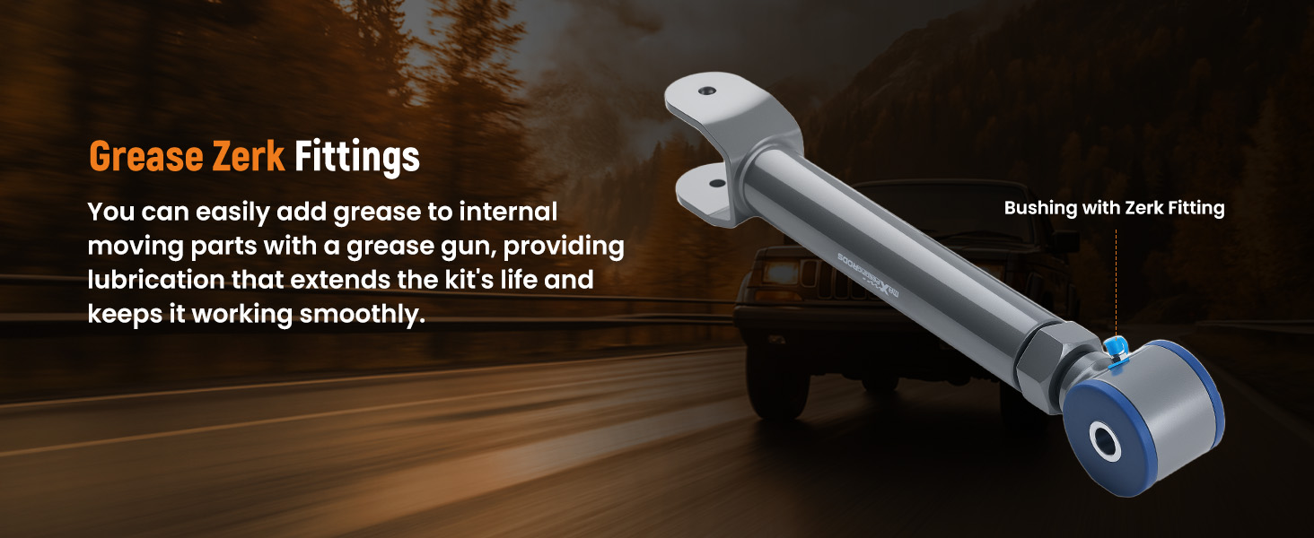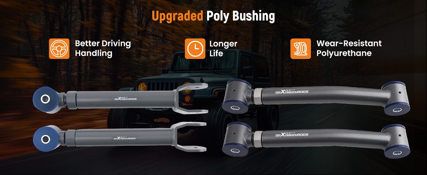 - High-quality poly bushings reduce abnormal squeaks and vibrations while driving, eliminate uneven tire wear